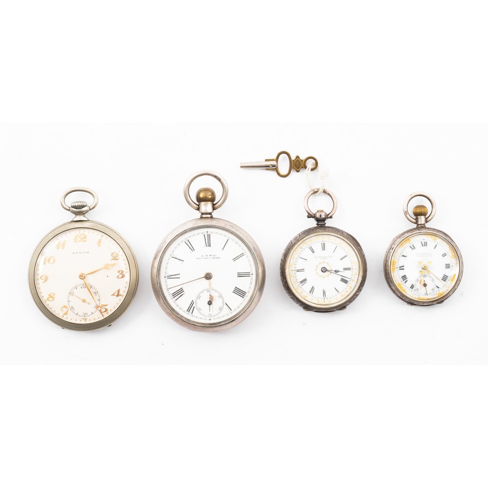 Orologio da tasca Zenith "Metal blanc Garanti", quadrante con numeri arabi, sottoquadrante dei secondi; orologio da tasca Waltham Mass. in argento 925, quadrante smaltato con numeri romani, sottoquadrante dei secondi; orologio da tasca La Mignonne in argento 935, quadrante smaltato con numeri romani, ricarica a chiave e orologio da tasca H. Samuel Manchester in argento 925, quadrante smaltato con numeri romani, sottoquadrante dei secondi (usure e da revisionare).