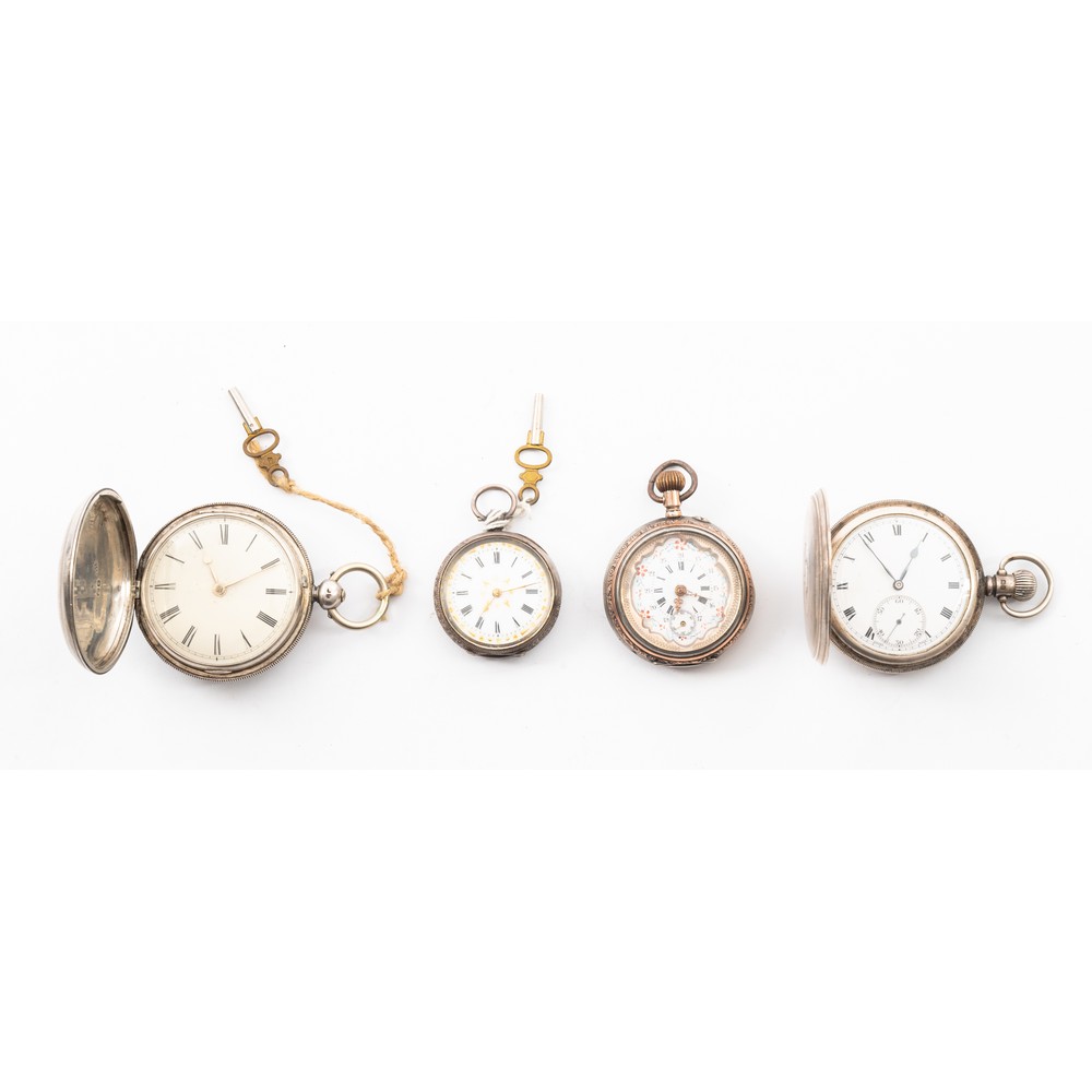 Orologio da tasca Cylindre 10 rubis in argento, quadrante smaltato con numeri romani, sottoquadrante secondi; orologio da tasca in argento 935, quadrante smaltato con numeri romani, ricarica a chiave; orologio da tasca William A. Bradshaw in argento 925, quadrante smaltato con numeri romani, sottoquadrante secondi e orologio da tasca Walter Foy in argento 925, quadrante smaltato con numeri romani, ricarica a chiave (usure e da revisionare).