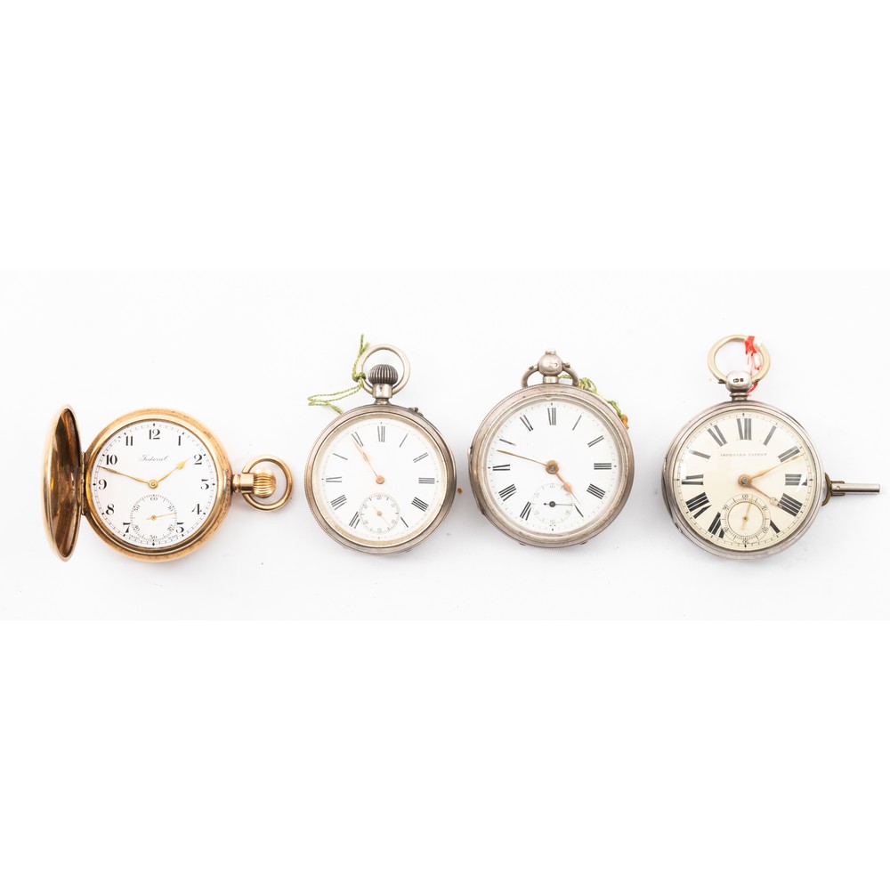 Orologio da tasca in argento 935, quadrante smaltato con numeri romani, sottoquadrante dei secondi; orologio da tasca in argento 925, quadrante smaltato con numeri romani, sottoquadrante dei secondi, ricarica a chiave (chiave mancante); orologio da tasca Federal in metallo dorato, quadrante smaltato con numeri arabi, sottoquadrante dei secondi e orologio da tasca Improved Patent in argento 925, quadrante smaltato con numeri romani, sottoquadrante dei secondi, ricarica a chiave (usure e da revisionare).