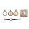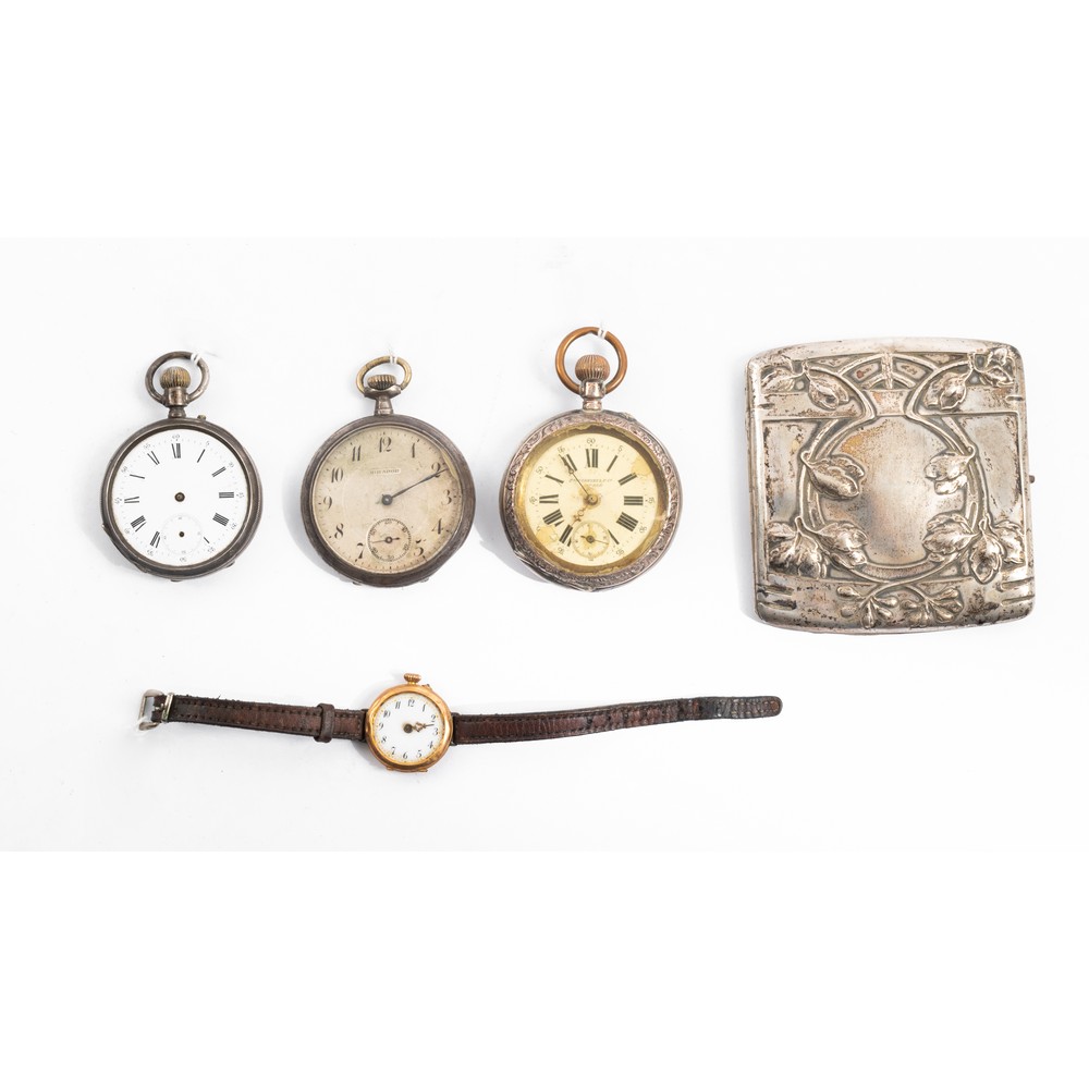 Tre orologi da tasca in argento, orologio da polso in oro giallo 18 KT e portasigarette in argento (usure).