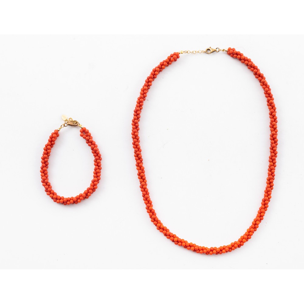 PARURE composta da collana e bracciale in corallo rosso intrecciato, suste in argento dorato 925 (g. 46,00).