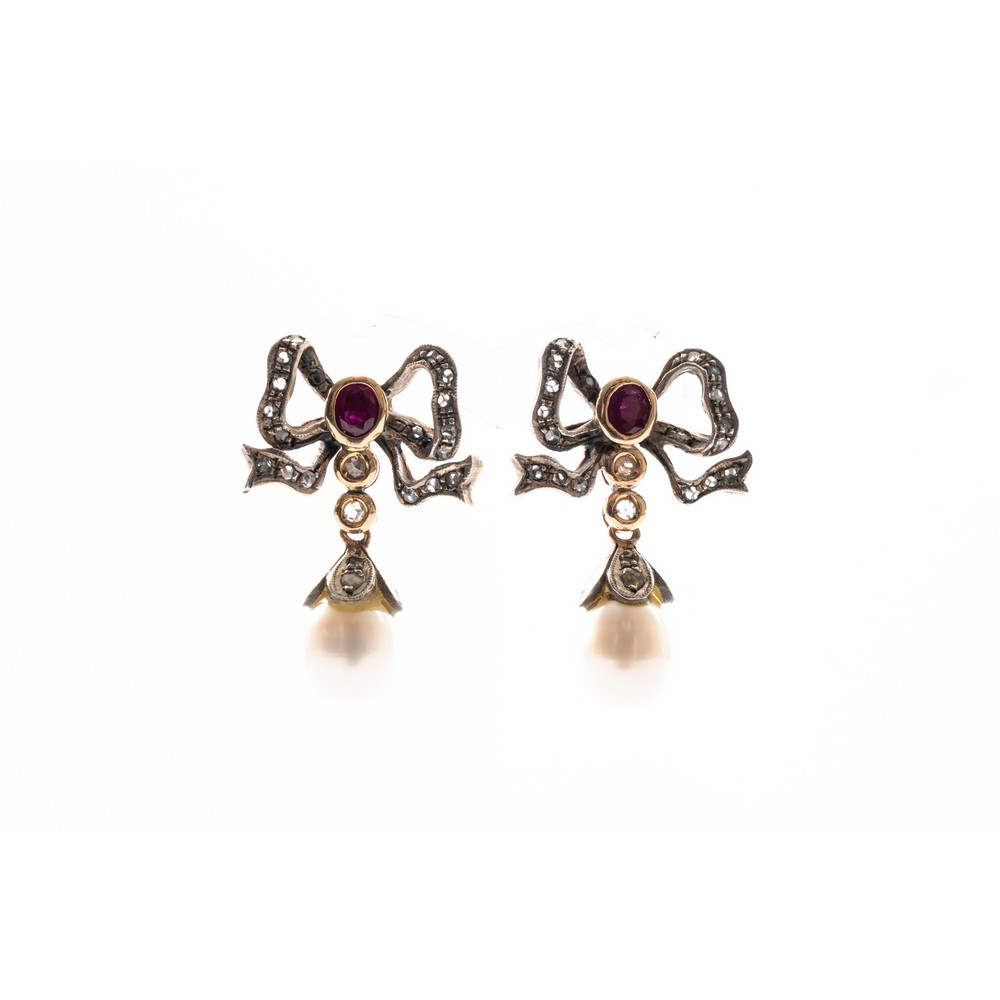 Lot 122 | ORECCHINI in oro 9 KT e argento con diamanti, rubini e perle