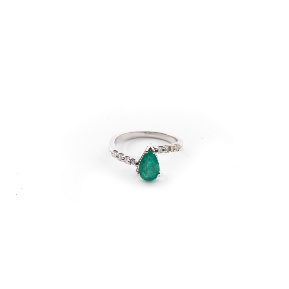 ANELLO in oro bianco 18 KT con diamanti taglio huit/huit ct. 0,03, diamanti taglio baguette ct. 0,12 e smeraldo taglio goccia ct. 0,30 (g. 3,10).