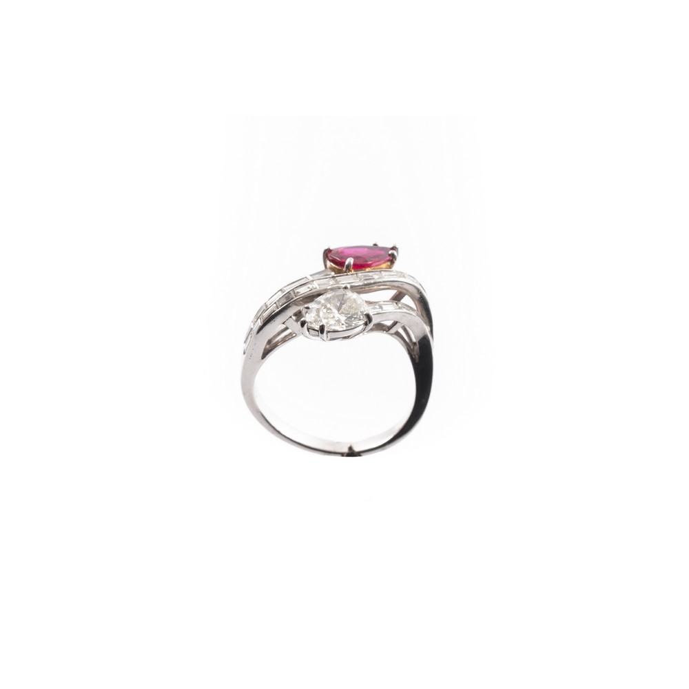 ANELLO in oro bianco 18 KT con diamanti taglio goccia ct. 0,85 peso di stima J COLOR VS2, diamanti taglio teps ct. 1,10 peso di stima J COLOR VS" e rubino ct. 1,30 peso di stima (g. 5,90).