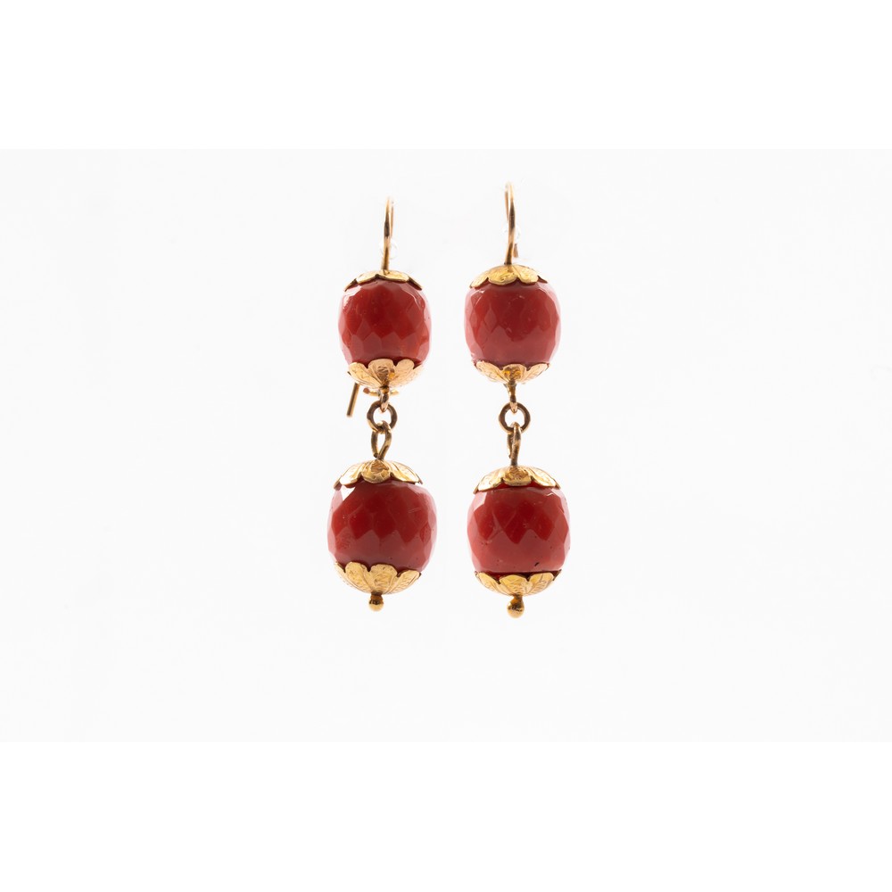 ORECCHINI in oro giallo 9 KT e corallo mediterraneo sfaccettato (g. 14,10) (usure).