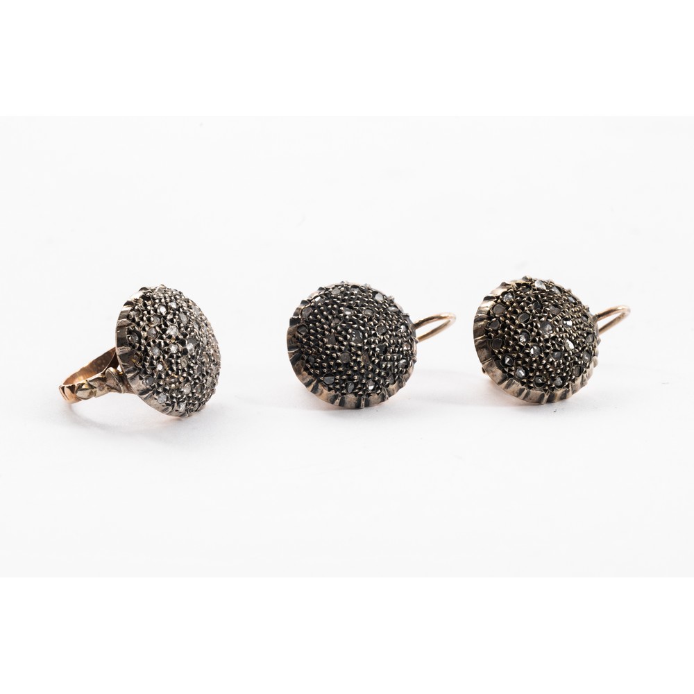 PARURE composta da anello e orecchini a toppa in oro giallo 9 KT e argento con diamanti ct. 1,30 peso di stima (g. 19,40) (un diamante mancante).