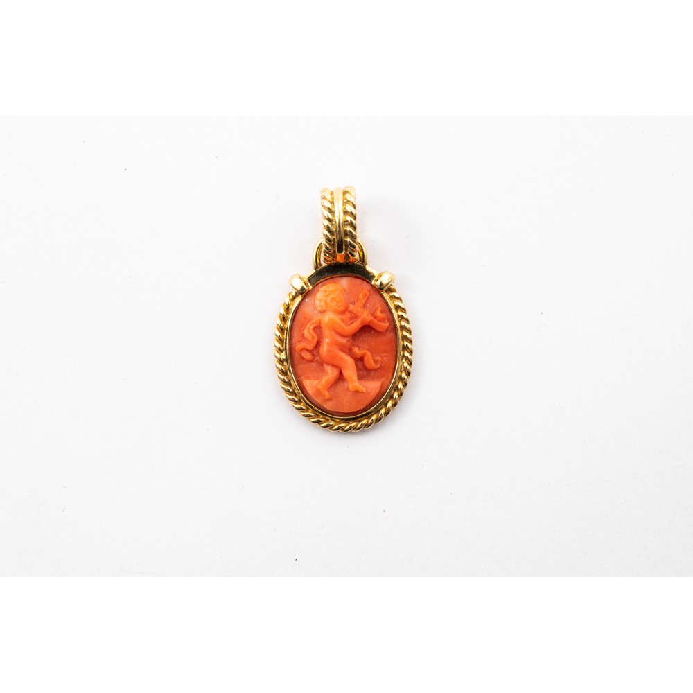 PENDENTE in oro giallo 18 KT lavorato con cammeo in corallo raffigurante "Putto con drappo" (g. 10,20).