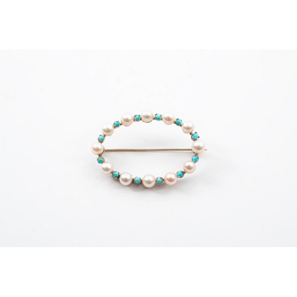 SPILLA in oro giallo 18 KT con perle coltivate e turchesi (g. 7,50).