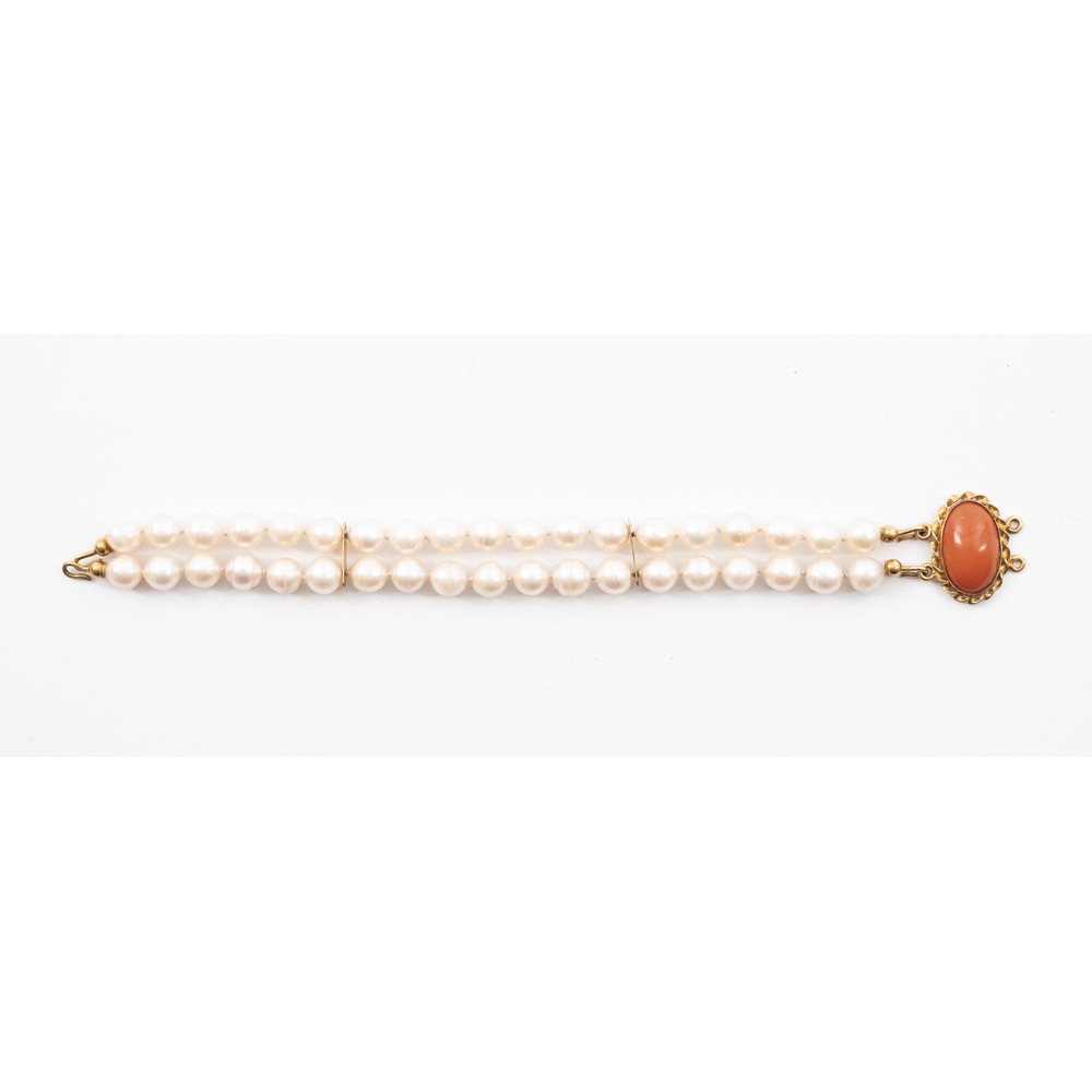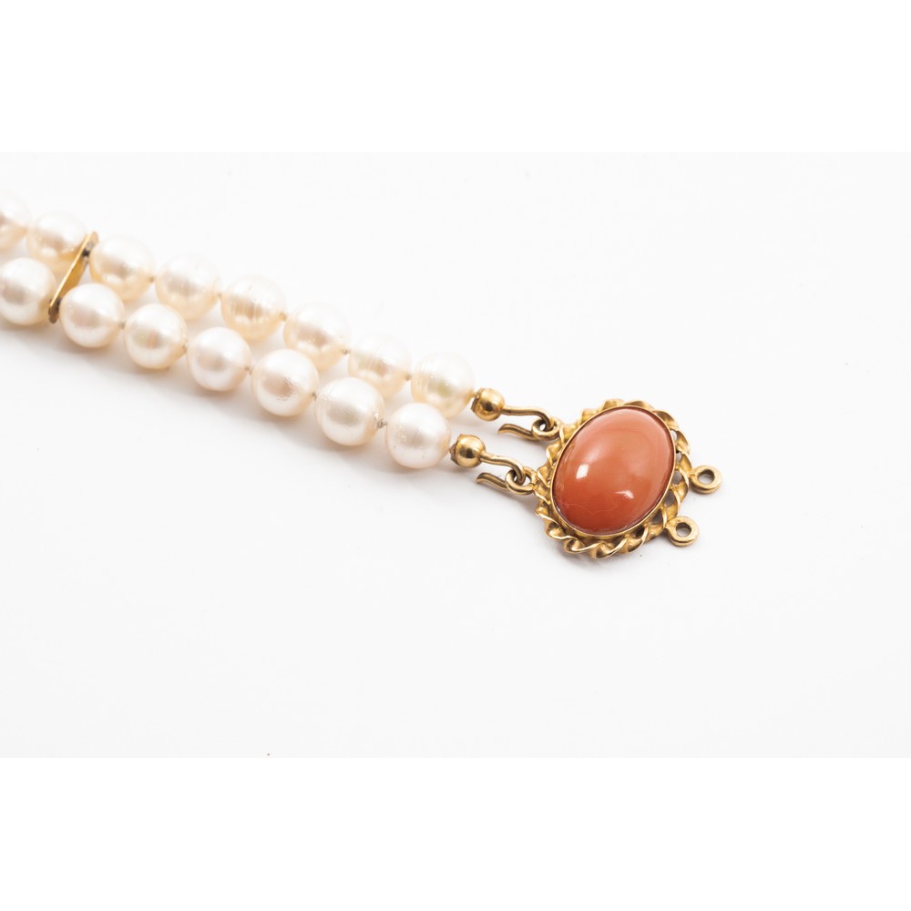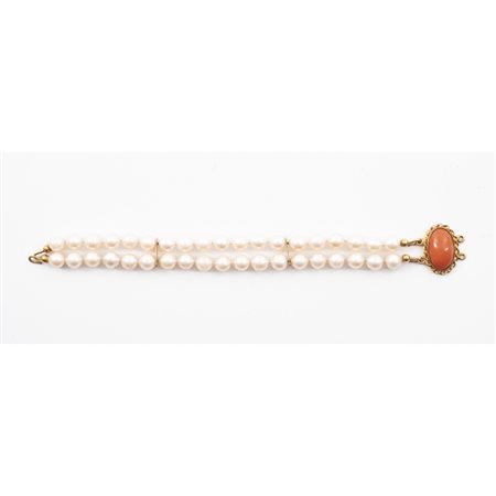 BRACCIALE a due fili di perle coltivate, susta e divisori in oro giallo 18 KT e cabochon in corallo salmone (g. 24,90).
