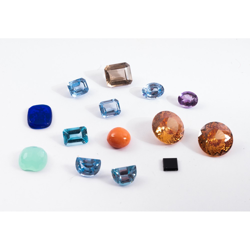 COLLEZIONE di quattordici pietre semipreziose composta da ametista, nove quarzi, bottone corallo, pasta vitrea, onice ed una acquamarina milk (g. 36,00) (usure).