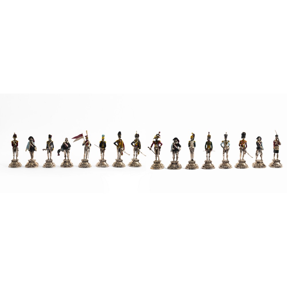 SEDICI SCULTURE in argento smaltato raffiguranti "Militari" entro cafanetti. Argentiere I. M. A. Di Guerci & C. - Alessandria (g. 4668).
