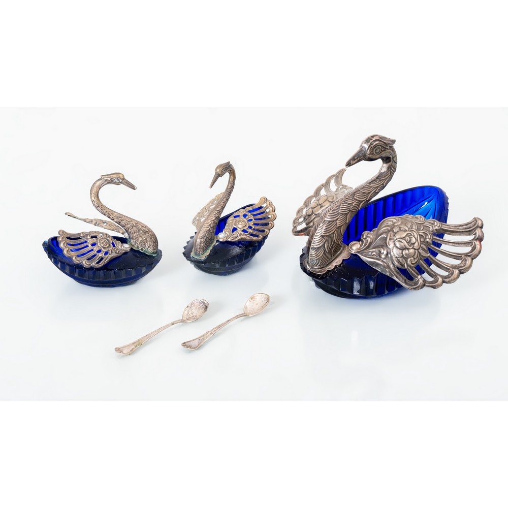 FORMAGGIERA E DUE SALIERE a guisa di cigno in argento sbalzato e cristallo blu con due cucchiaini adattati (g. 421 peso lordo).
