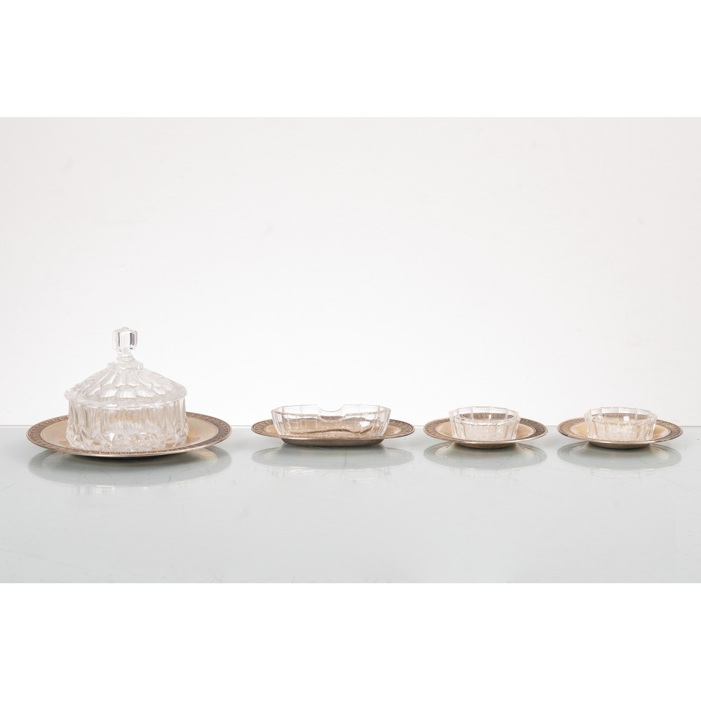 SET da tavolo composto da sale e pepe, formaggiera e porta stuzzicadenti con piattini e due cucchiaini in argento sbalzato. Punzone argentiere 197 FI (g. 130) (piccole sbeccature nel coperchio).