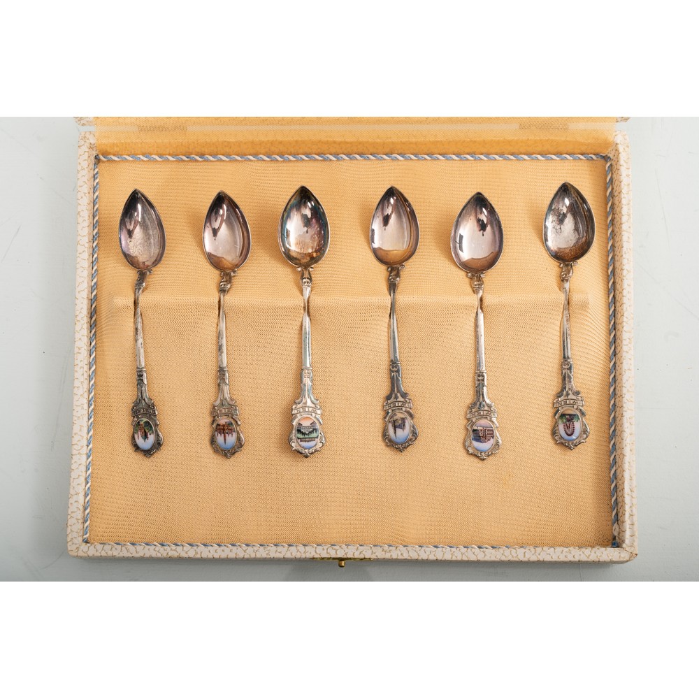 Sei cucchiaini in argento con smalti in porcellana entro scatola.