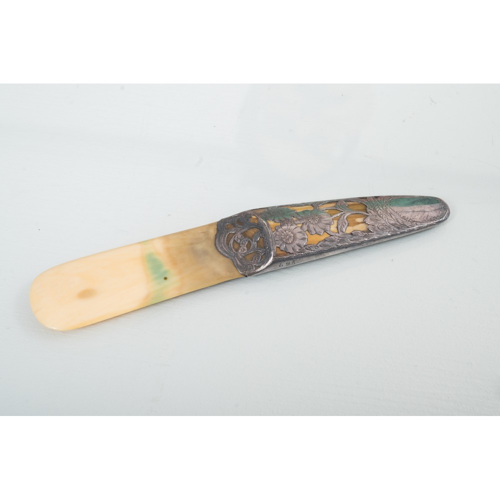 Tagliacarte Vittoriano in argento cesellato a motivo floreale e fogliaceo ed osso (lievi usure).