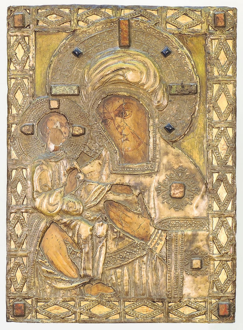 GRANDE ICONA Scuola russa della fine del XIX secolo Madonna con Bambino tempera su tavola, ritza in tole sbalzata, pietre dure e marmi incastonati, difetti cm 67x44 ICON, RUSSIAN SCHOOL OF THE END OF 19TH CENTURY