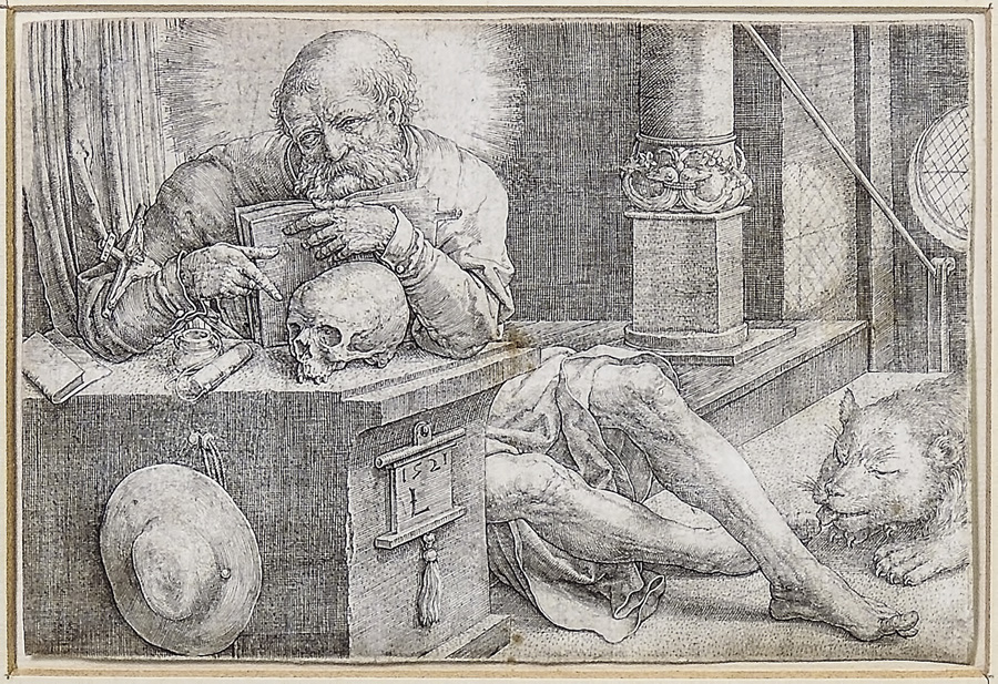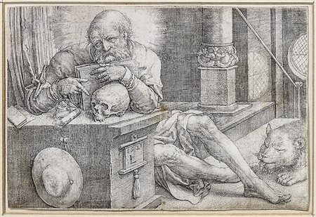 LUCAS VAN LEYDEN (1494-1533) San Gerolamo incisione, in cornice, lievi tracce di foxing, rifilata entro la linea di inquadramento mm 100x147 Bartsch VII p. 398 n. 114; Filigrana Holl. n. 20. Foglio Al verso reca cartiglio Il Bulino Antiche Stampe, Milano SAINT JEROME IN HIS STUDY, ENGRAVING, WITH LABEL ON REVERSE