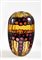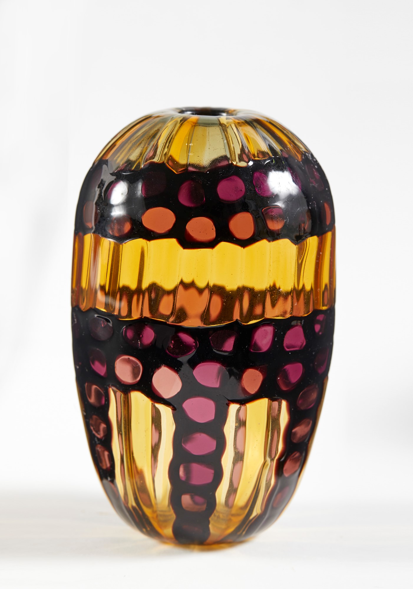 VITTORIO FERRO (1932 - 2012) Vaso in vetro ocra con motivi decorativi sui toni del vinaccia e del nero. XX secolo, Italia. Cm 15x9.