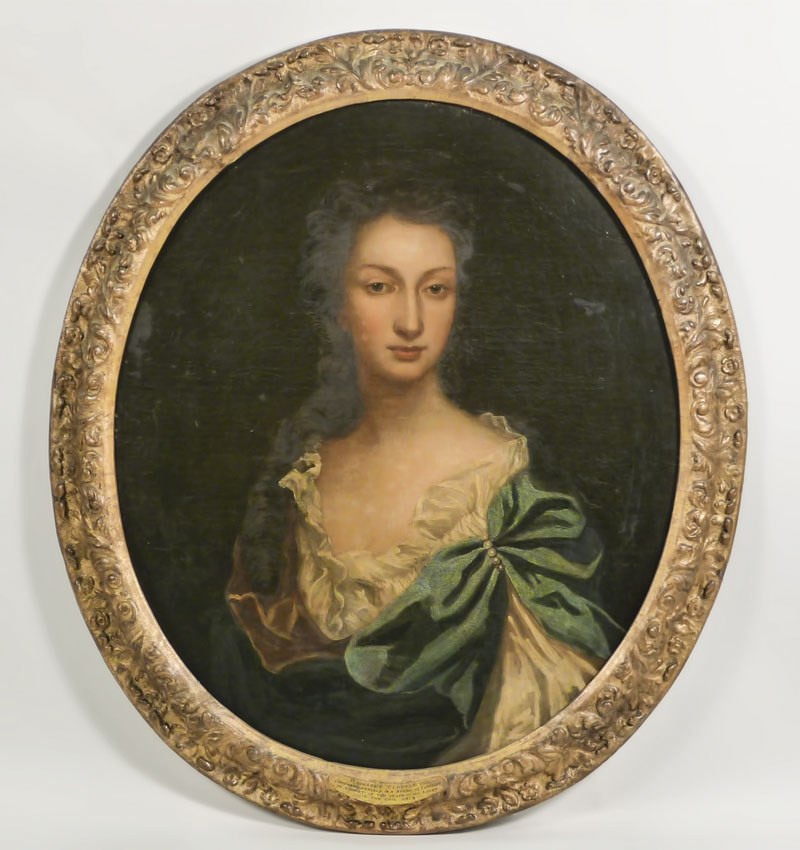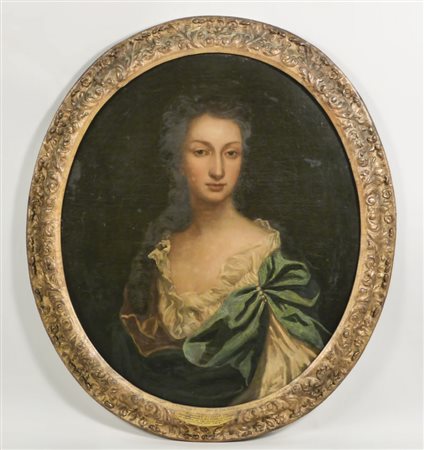 GODFREY KNELLER ATTRIBUITO (1646-1723) Ritratto di Margaret Clopton olio su tela in ovale, in cornice intagliata e dorata cm 74,5x63 ATTRIBUTED TO GODFREY KNELLER (1646-1723) PORTRAIT OF MARGARET CLOPTON, OIL ON OVAL CANVAS