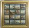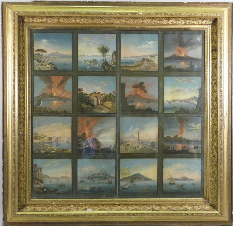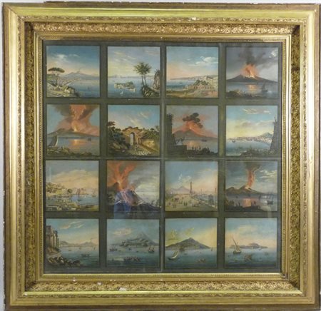 RACCOLTA DI VEDUTE NAPOLETANE raccolta di sedici gouache su carta, in un'unica cornice in legno e pastiglia dorata cm 116x116, ogni veduta cm 26x26 La serie è composta da quattro fogli ciascuno dipinto con quattro gouaches NAPLES VIEWS, SIXTEEN GOUACHE ON PAPER