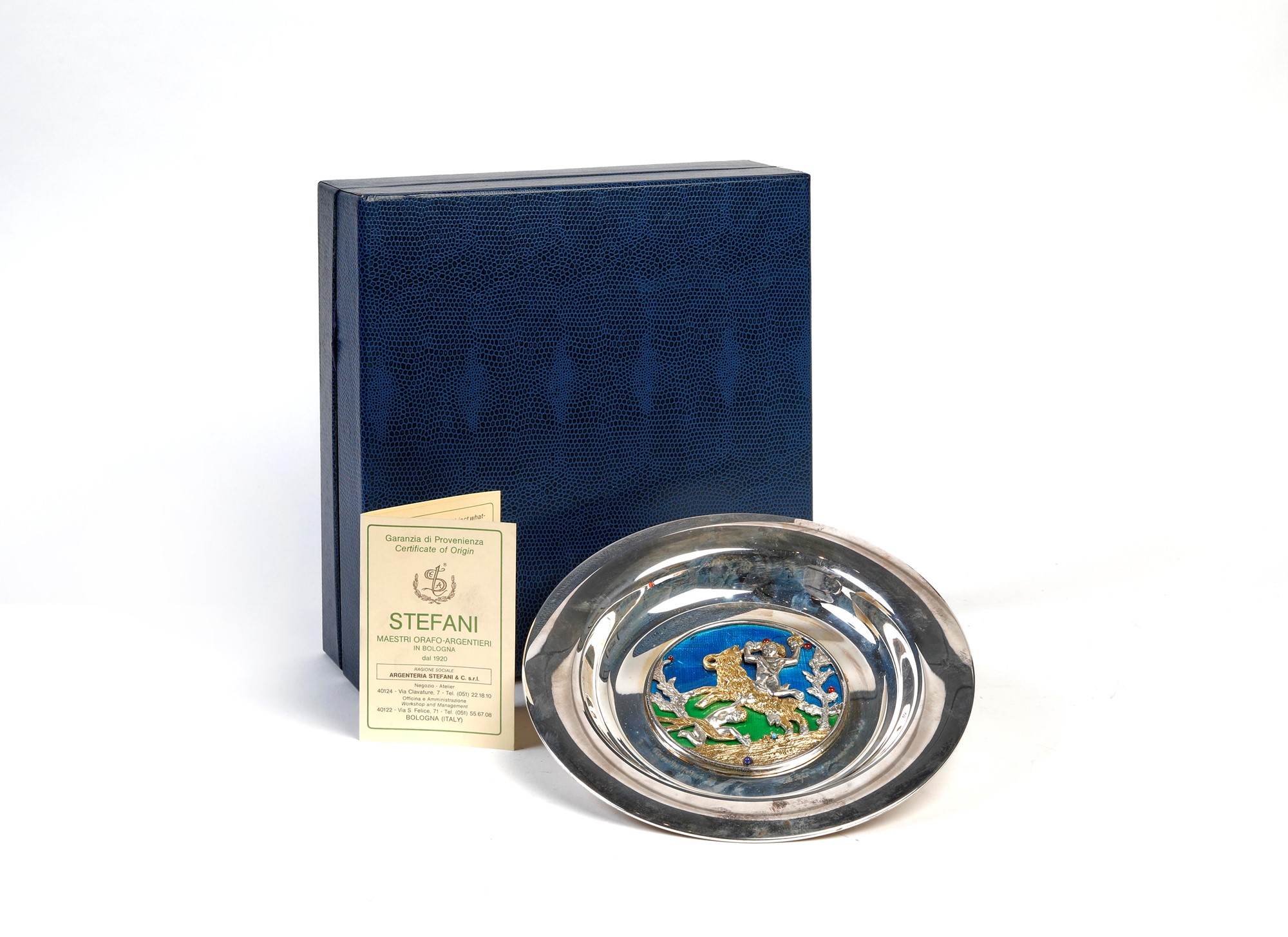 STEFANI MAESTRI ORAFO ARGENTIERI, XX secolo. Fondina dal titolo “Giuochi felici”. Argento 800, parti dorate con oro 24 Kt, smalti a gran fuoco, cabochon di pietre dure. Alla base reca firma A. Stefani. Reca sotto la base marchio, tecnica e punzoni. Peso 312 gr., diametro 22 cm. Reca numeri di tiratura 138/199.