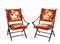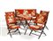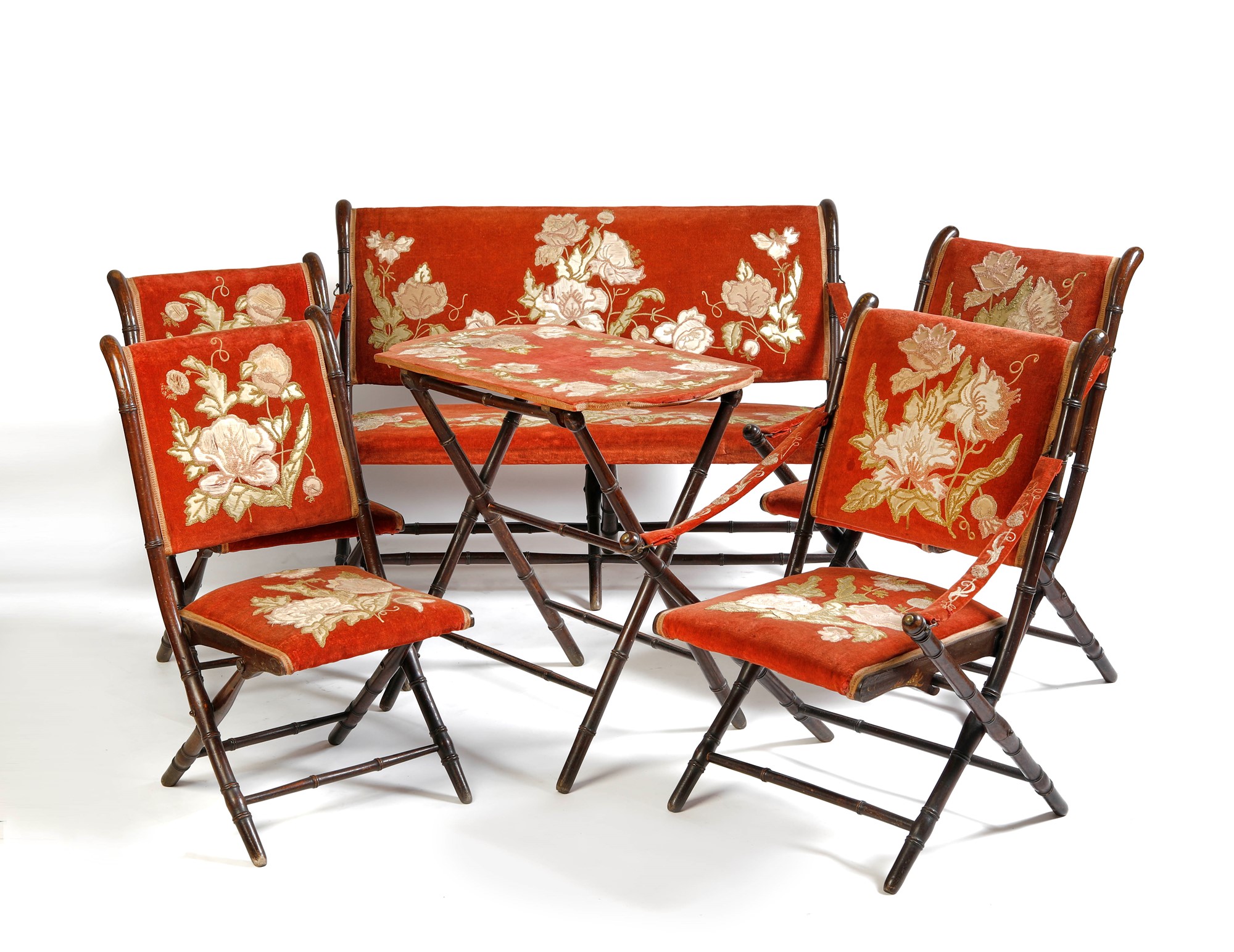 Salottino da pic nic da carrozza. Set composto da un divanetto, due poltroncine, due sedie e un tavolino pieghevoli. Realizzate in legno e velluto rosso ricamato. Napoli, XIX secolo. Cm divano: 80x130x65; poltroncine: 86x50x60; sedie: 80x45x54; tavolino: 80x70x47. (lievi difetti)