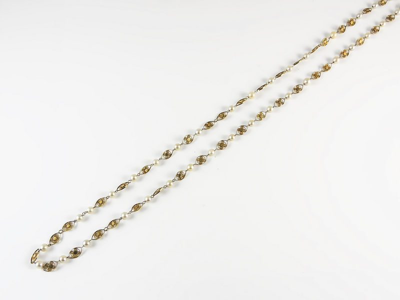 LUNGA COLLANA IN ORO GIALLO E PERLE realizzata con piccole placche a navette...
