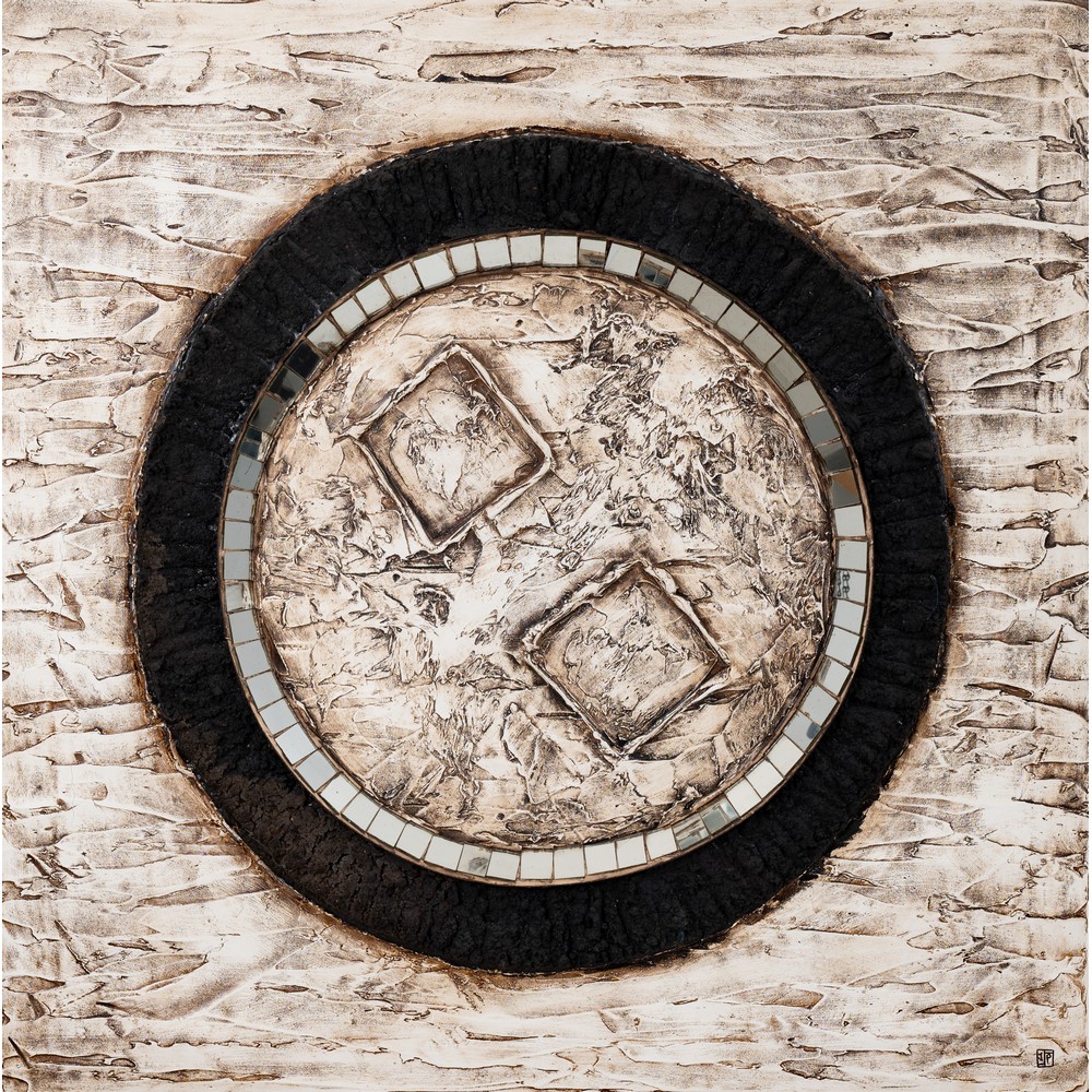 J P, Olio, tela, ferro, vetro specchiato e resina