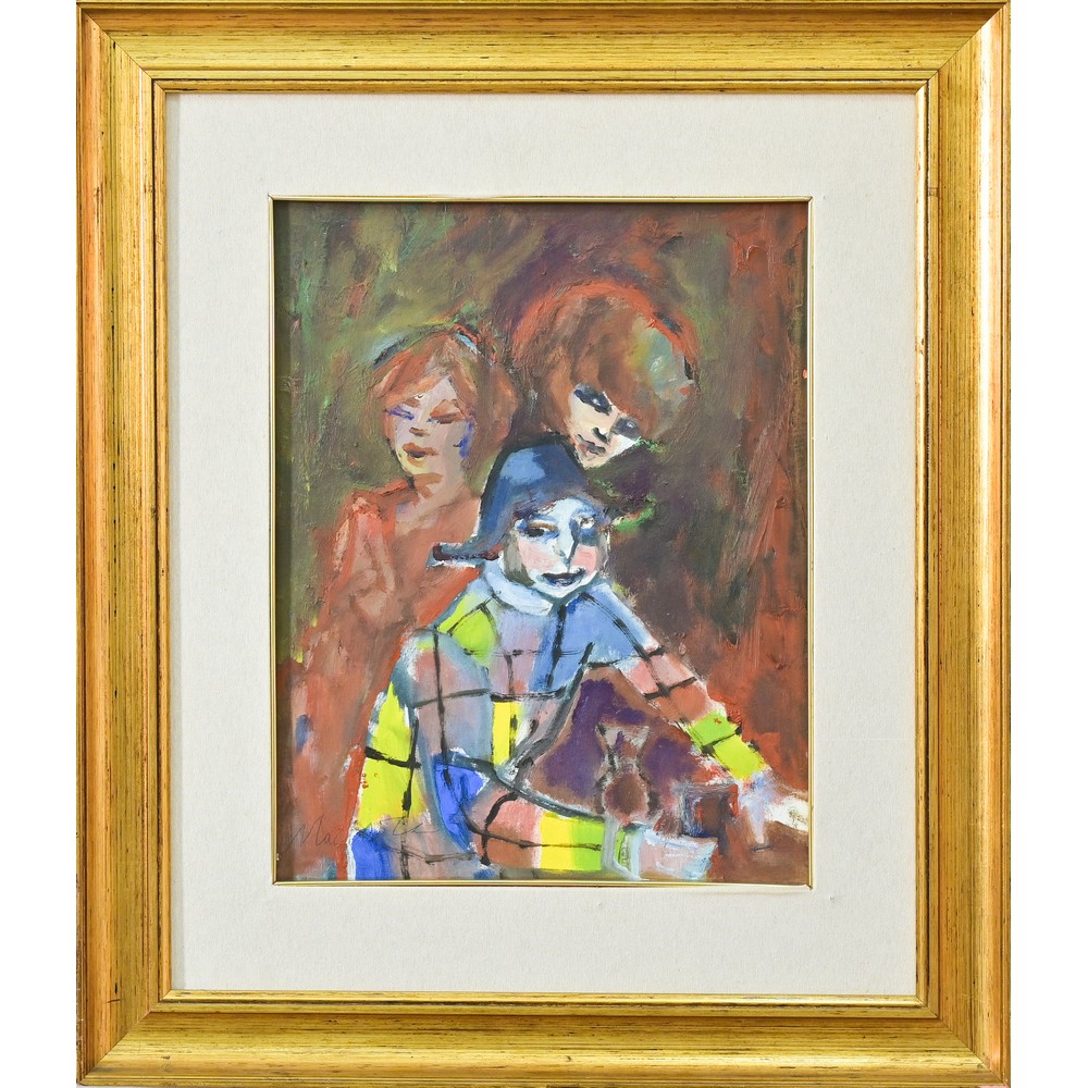 MINO MACCARI, Arlecchino al bar, Olio su cartone telato