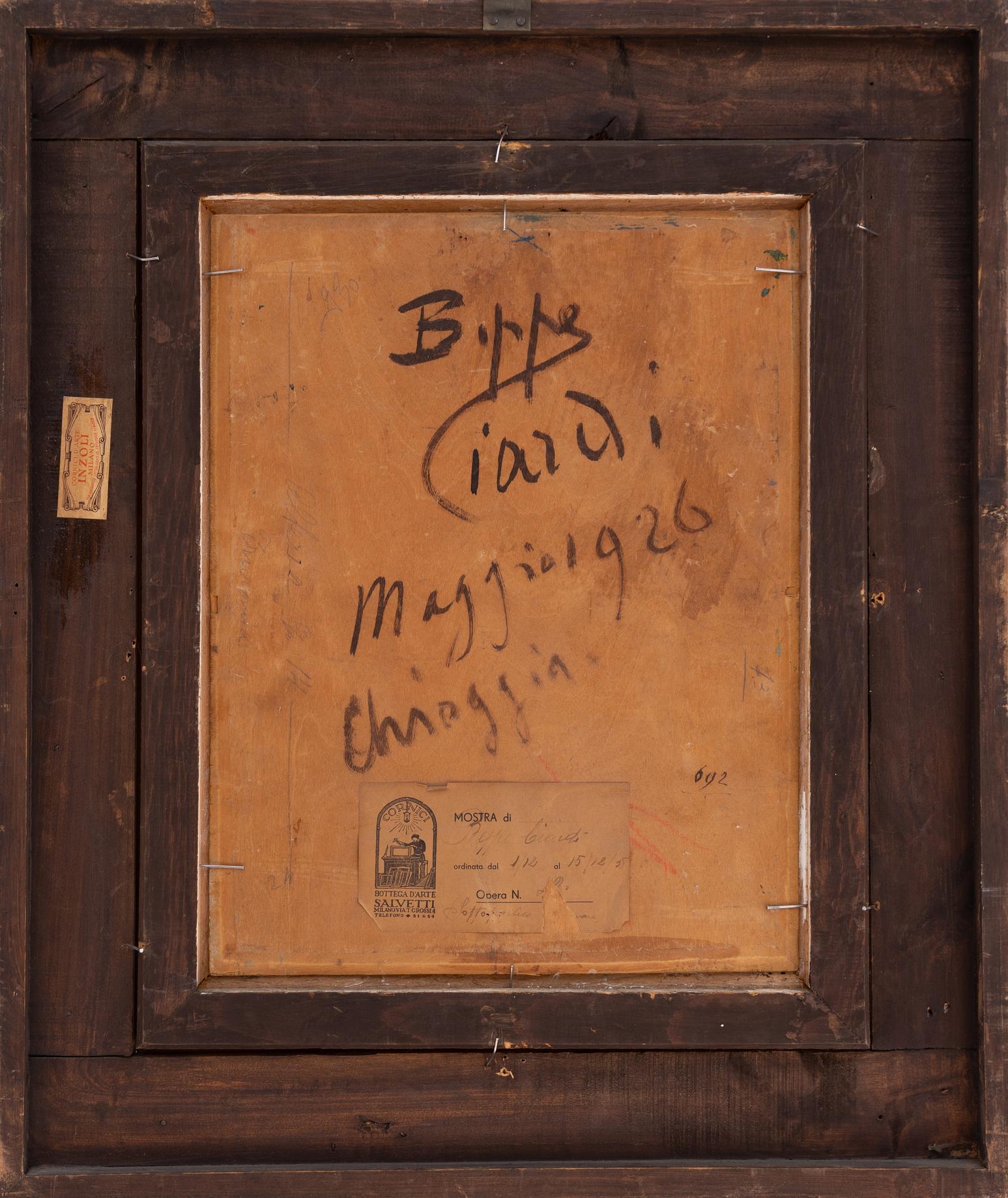 - Giuseppe "Beppe" Ciardi (1875-1932) è stato un pittore italiano di rilievo, noto per le sue opere paesaggistiche che catturano l'essenza della laguna veneta e della campagna trevigiana. Nato a Venezia il 18 marzo 1875, figlio del pittore Guglielmo Ciardi e di Linda Locatelli, Beppe crebbe in un ambiente profondamente influenzato dall'arte. Suo padre, uno dei principali esponenti del paesaggismo realista veneto, e sua madre, figlia del ritrattista Gianfranco Locatelli, gli trasmisero fin da giovane una passione per la pittura.Fin da bambino, Beppe mostrò un interesse profondo per l'arte, trascorrendo molto tempo nello studio del padre e tentando i suoi primi schizzi. Nel 1896, all'età di 21 anni, si iscrisse all'Accademia di Belle Arti di Venezia, dove fu allievo di Ettore Tito, un noto pittore verista. Durante gli anni accademici, Beppe affinò le sue tecniche pittoriche, sviluppando uno stile personale che univa l'influenza del padre a una sensibilità propria.Nel 1899, Beppe esordì alla Biennale di Venezia con l'opera "Monte Rosa" e il trittico "Terra in fiore", segnando un distacco dalla pittura paterna e avvicinandosi alle tematiche divisioniste espresse da Giovanni Segantini. L'anno successivo, nel 1900, ottenne il premio Fumagalli all'Esposizione della Permanente di Milano con "Traghetto delle Agnelle". Nel 1904 partecipò all'Esposizione internazionale di San Francisco, dove ricevette una medaglia d'argento, e nel 1906 espose undici quadri della serie "Silenzi notturni e crepuscolari" all'Esposizione internazionale del Sempione.Nel 1912, alla X Biennale di Venezia, Beppe tenne una mostra personale con 45 tele, tra cui la nota "I saltimbanchi". Dopo una breve interruzione dovuta alla partecipazione alla Prima Guerra Mondiale, riprese la sua attività artistica, partecipando a numerose Biennali di Venezia, segnate dalla diffusione di movimenti avanguardistici come il Futurismo e l'Espressionismo.Oltre alla pittura, Beppe Ciardi alternò la sua attività artistica con quella di agricoltore, trascorrendo la vita tra Venezia, Canove di Asiago e Quinto di Treviso, profondamente legato alla campagna trevigiana che riprodusse spesso nelle sue opere. La sua produzione artistica comprende numerosi paesaggi, marine e scene di vita quotidiana, caratterizzati da una luce vibrante e una tecnica pittorica raffinata.Beppe Ciardi morì improvvisamente il 14 giugno 1932 a Quinto di Treviso, dove fu sepolto. La moglie Emilia Rizzotti, modella di numerosi suoi lavori, raccolse una grande quantità di opere presso Villa Ciardi, istituendo una collezione che terminò con la cessione delle opere da parte degli eredi. Nel tempo, furono organizzate diverse mostre postume, tra cui nel 1932 presso la Galleria Pesaro di Milano, nel 1935 alla Biennale di Venezia e al Jeu de Paume di Parigi, nel 1936 presso l'Associazione Nazionale delle Famiglie dei Caduti di Guerra di Milano, nel 1939 al Caffè Pedrocchi di Padova, nel 1953 alla Galleria Giosio di Roma e nel 1983 alla Mostra d’Arte Trevigiana.Le opere di Beppe Ciardi sono oggi conservate in numerose collezioni pubbliche e private, testimoniando l'importanza del suo contributo all'arte paesaggistica italiana.