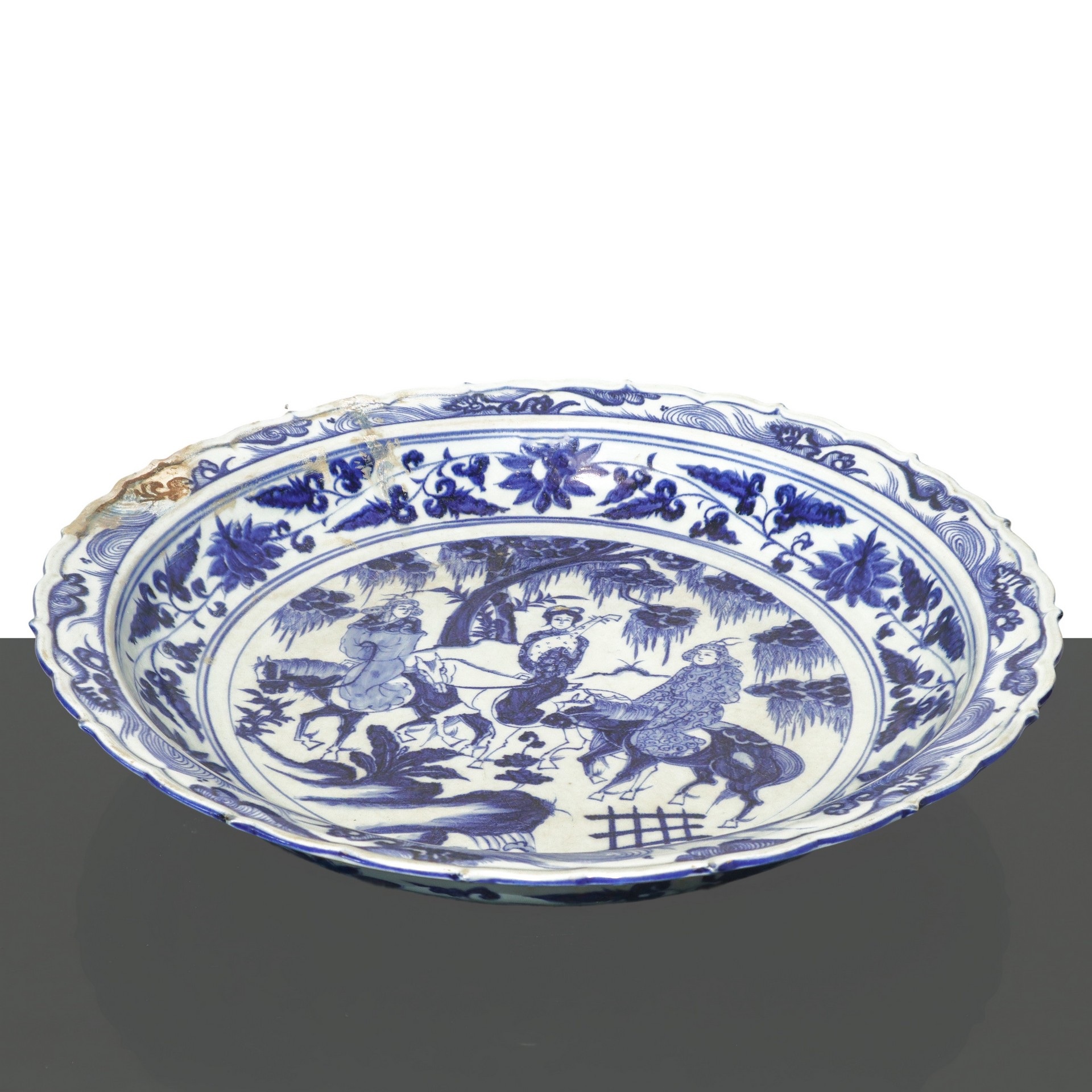 Grande piatto cinese in ceramica bianca con scene di personaggi storici dipinte in blu, Yuan , Dinastia diametro cm 43 Presenza di restauri Presenza di restauri