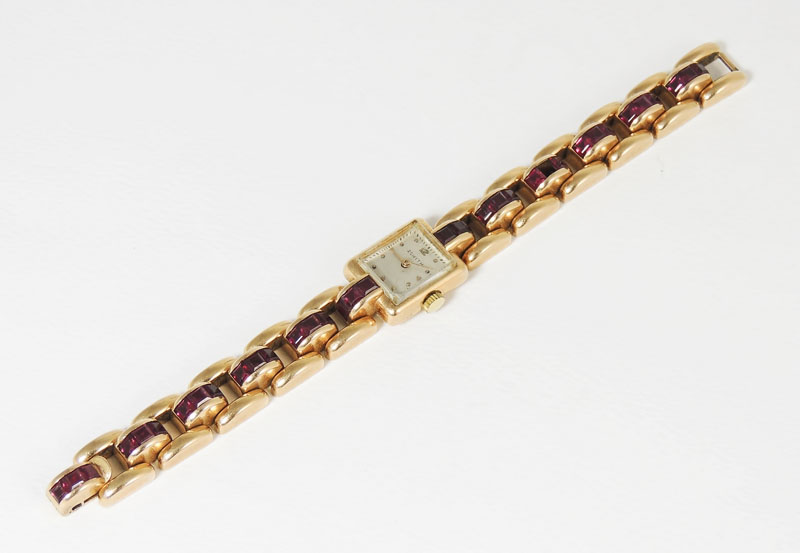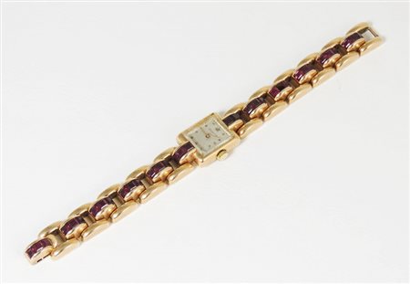 OROLOGIO DA POLSO DA SIGNORA IN ORO GIALLO E RUBINI SINTETICI Zenith, Anni Quaranta ornato con rubini sintetici taglio carré gr 57,3 LADY GOLD AND SYNTETHIC RUBIES WATCH