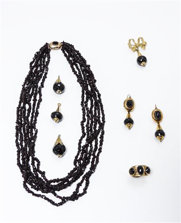 PARURE IN ORO GIALLO E GRANATI fine del XIX/inizio del XX secolo composta da collier a più fili, anello con tre granati ovali, orecchini con pendente staccabile, spilla e tre pendenti (7) GOLD AND GARNETS PARURE