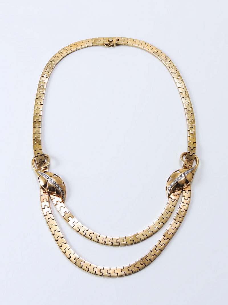 COLLIER IN ORO GIALLO E DIAMANTI Anni Quaranta realizzato a maglia piatta e impreziosito da motivi a foglie tempestate in diamanti taglio huit-huit gr 58,3 GOLD AND DIAMONDS COLLIER