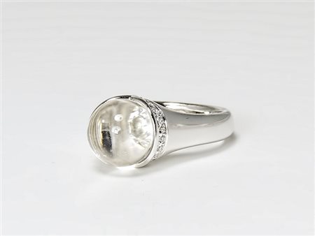 ANELLO IN ORO BIANCO, CRISTALLO DI ROCCA E DIAMANTI Mauboussin realizzato come una cupola in cristallo di rocca che racchiude un brillante, gambo impreziosito da brillanti gr 10,8 firmato Mauboussin 1380 WHITE GOLD, ROCK CRISTAL AND DIAMONDS RING MAUBOUSSIN