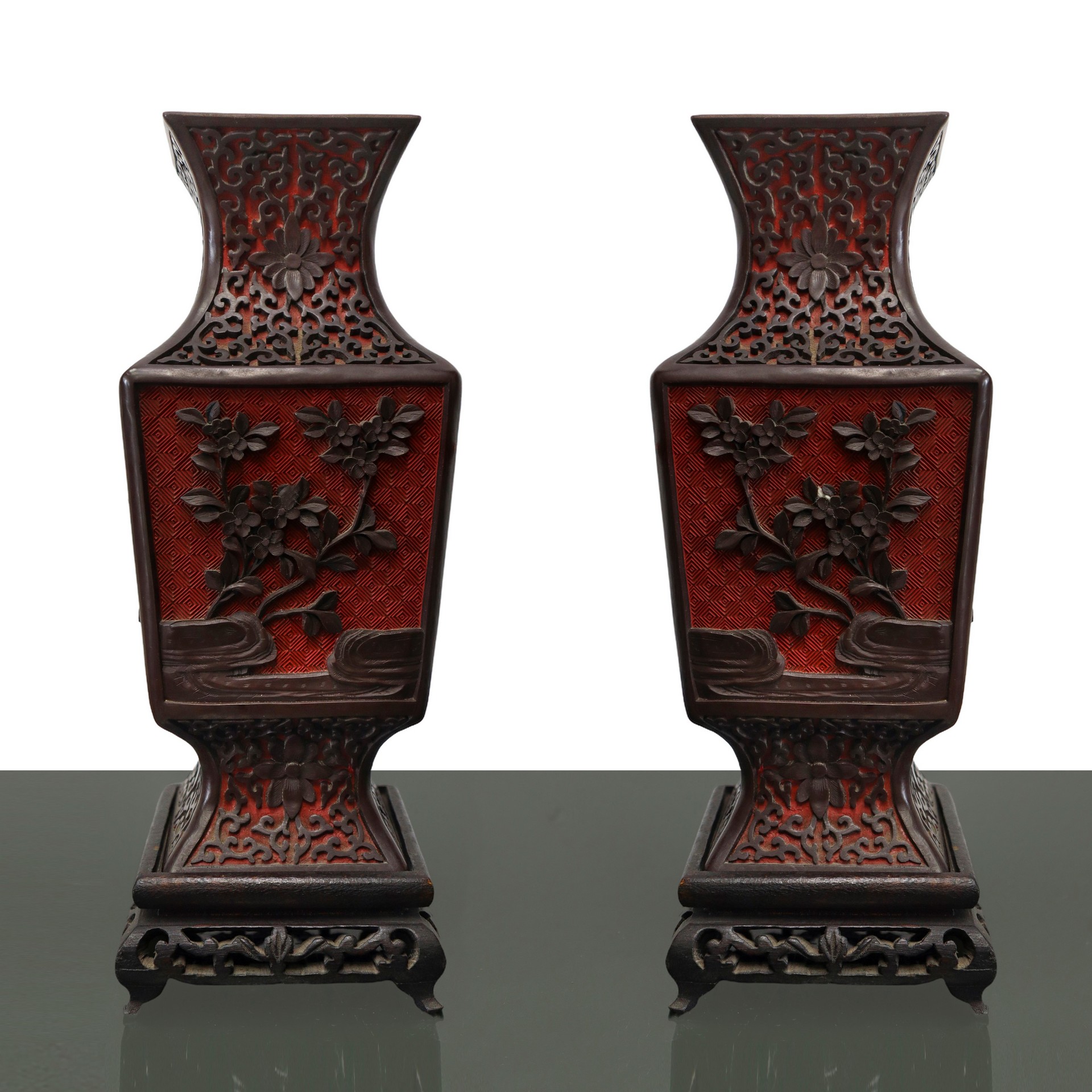 Coppia di vasi cinesi con lacca rosso cinabro e con decorazioni floreali intagliate