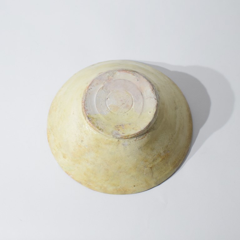 Ciotola in terracotta chiara a pareti sottili ingobbiate di bianco e dipinte con banda di chevron a motivo ondulato e puntinato in bruno manganese sul bordo superiore. Il tondo centrale interno presenta una figura stilizzata di uccello, eseguita a pennello. Questa produzione si diffuse nell'antica regione del Khorassan durante la dinastia Samanide (819-999). Restauri marginali visibili lungo il bordo.