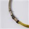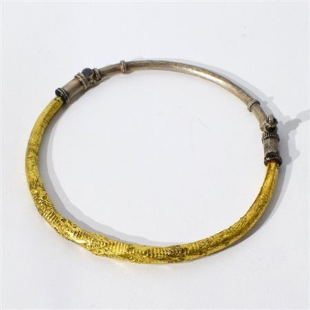 Collare rigido con apertura laterale tramite perno, la porzione superiore che va sulla nuca in argento punzonato con lunga iscrizione in caratteri devanagari sul retro. La porzione ornamentale in metallo modellato con figure geometriche intrecciate e ricoperto di lamina d'oro cesellata con cerchi e linee parallele ripetute.
