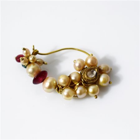Montatura in oro con castone centrale a forma di goccia o piccolo mango (simbolo di buon auspicio) con diamante. Sormontato da grappoli di micro perle alternate a rubini e smeraldi. Generalmente indossato dalle donne sposate come simbolo del loro status coniugale, l'ornamento da naso veniva anche considerato un elemento di bellezza nell'India Meridionale ed uno degli indicatori di cui le future suocere si servivano per scegliere la futura nuora. Tipicamente usato dalle donne hindi, poteva però essere indossato anche dalle musulmane e dai bambini musulmani a cui veniva donato un piccolo anello da naso (nathni) nel nome di qualche santo importante.