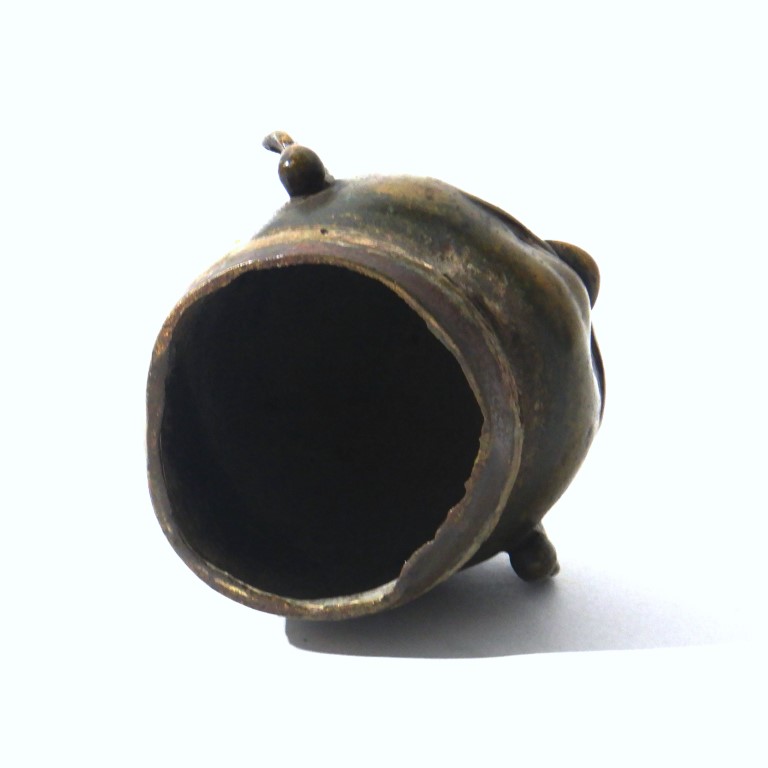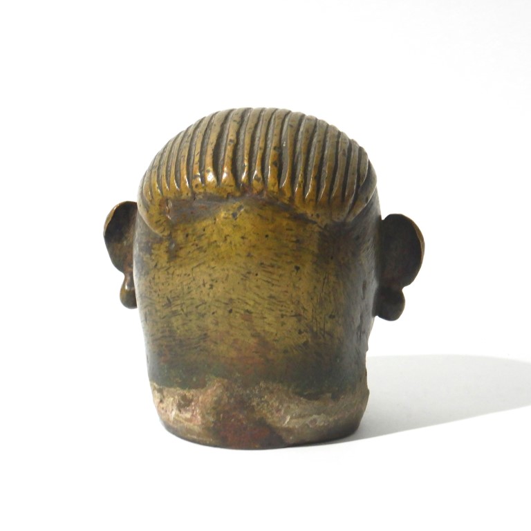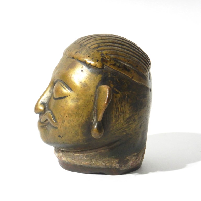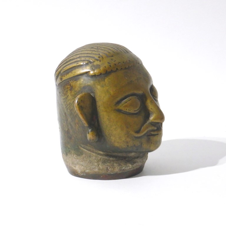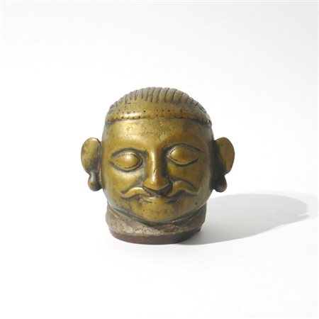 Fusione in bronzo con interno cavo, raffigurante il volto di Shiva caratterizzato da lunghi baffi, sguardo penetrante e l'acconciatura a ciocche di capelli (jata).