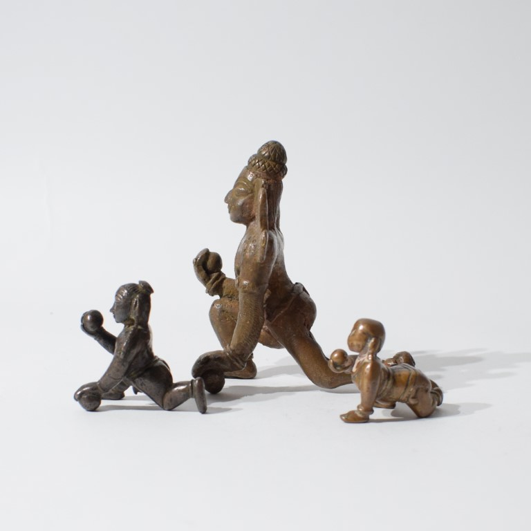 Fusioni in bronzo a cera persa raffiguranti Bala Krishna a carponi con la noce di burro (makhan), un soggetto particolarmente amato e diffuso nella bhakti Vaishnava.