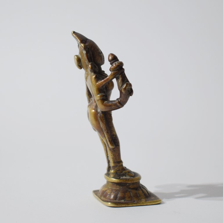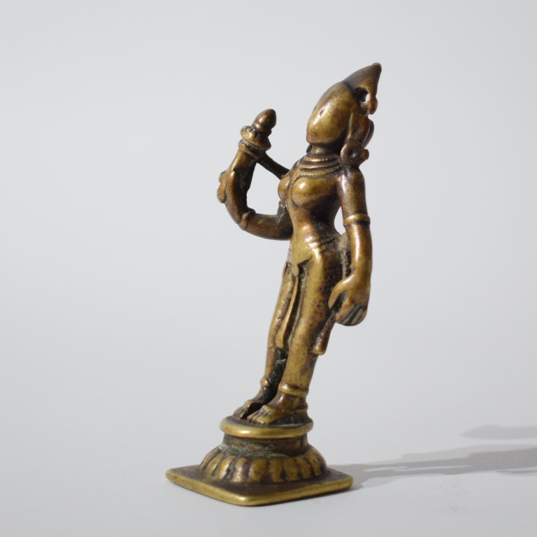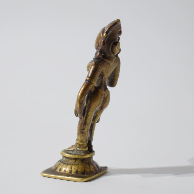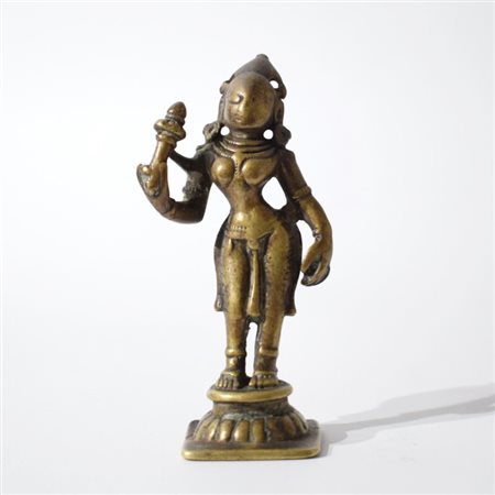 Scultura votiva raffigurante una divinità femminile dell'universo induista, probabilmente riconducibile a Lakshmi o a Parvati, rappresentata in posizione eretta (samabhanga) su una base circolare a doppio gradino decorata a petali stilizzati. La dea è raffigurata con il busto proteso leggermente in avanti e fianchi sinuosi, secondo i canoni della bellezza ideale dell'India dravidica. Il braccio destro solleva un fiore di loto (padma), emblema di purezza, fertilità e manifestazione divina, mentre il sinistro è disteso lungo il corpo con la mano aperta in gesto di dono o accoglienza (varadamudra).