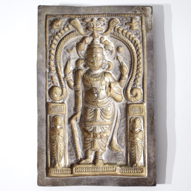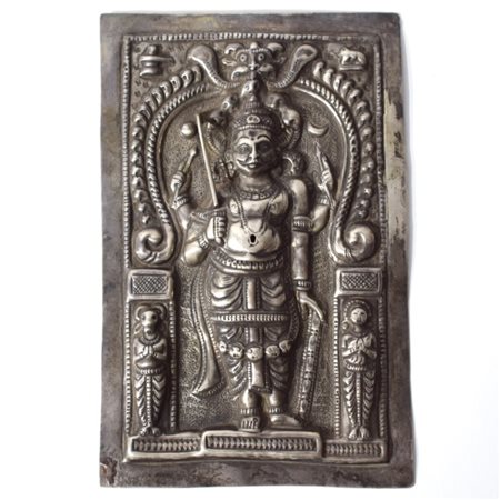 Bassorilievo devozionale raffigurante Virabhadra, forma guerriera e terrifica del dio Shiva, manifestatosi per vendicare l'affronto di Daksa. La divinità è raffigurata in posizione eretta sotto un arco ornato da naga intrecciati, indossa numerosi ornamenti, tra cui la corona jatamukuta e un dhoti finemente inciso. Shiva guerriero brandisce nella sua mano destra una spada, elemento tridimensionale separato e applicato alla superficie della lamina ed è affiancato da due personaggi: Daksa con testa di ariete punito da Virabhadra per non aver onorato Shiva e Bhadrakali, emanazione potente e distruttiva della dea Parvati, creata per assistere Virabhadra. La composizione è completata da un torana decorato con motivi vegetali, simboli lunari e solari, e altri emblemi shivaiti come il linga e il toro Nandi.