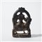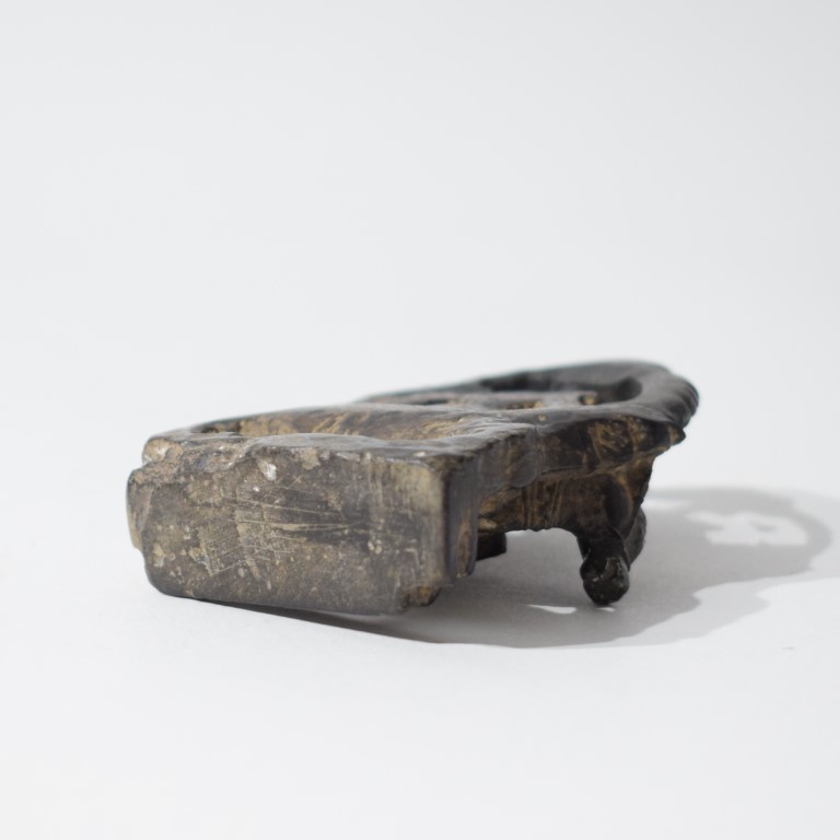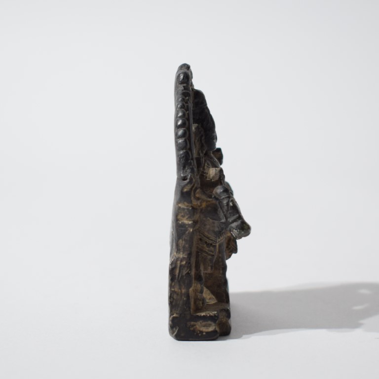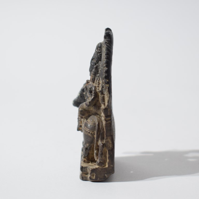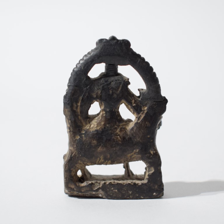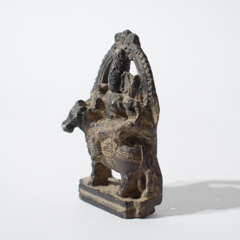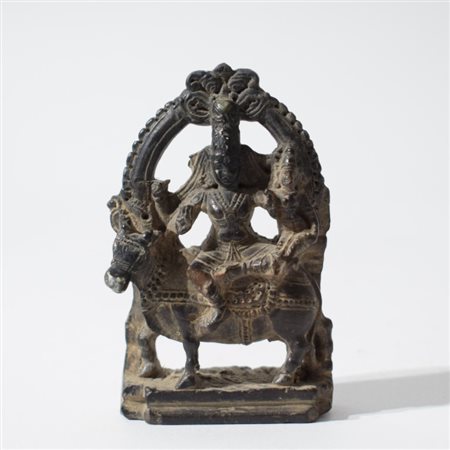 Piccola scultura in pietra scura, raffigurante la coppia divina seduta su Nandi, l'animale veicolo (vahana) di Shiva. Le tre figure sono completate da ricchi dettagli decorativi, tra cui: la la corona di Shiva (jatamukuta), la collana a più fili, i bracciali, le acconciature e i panneggi minuziosamente incisi. La composizione è racchiusa in un'aureola semicircolare (prabhamandala) simbolo di protezione e divinità.
