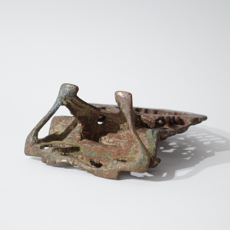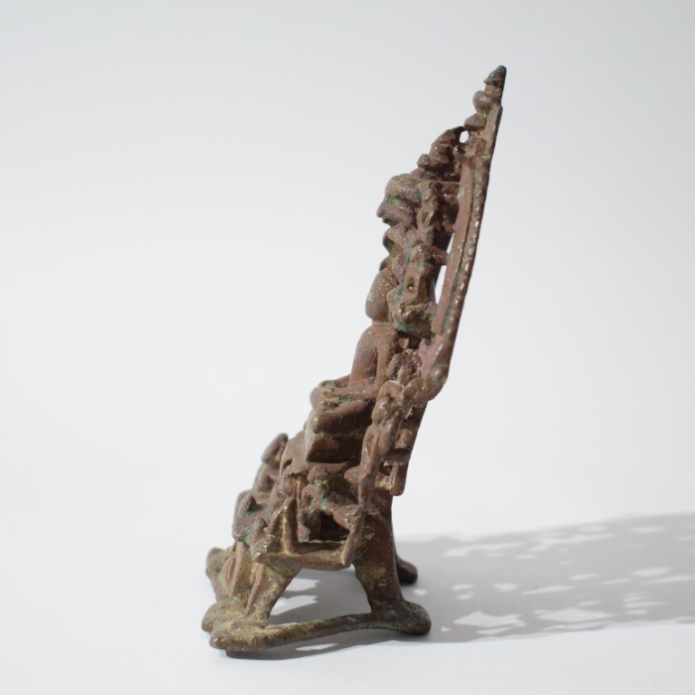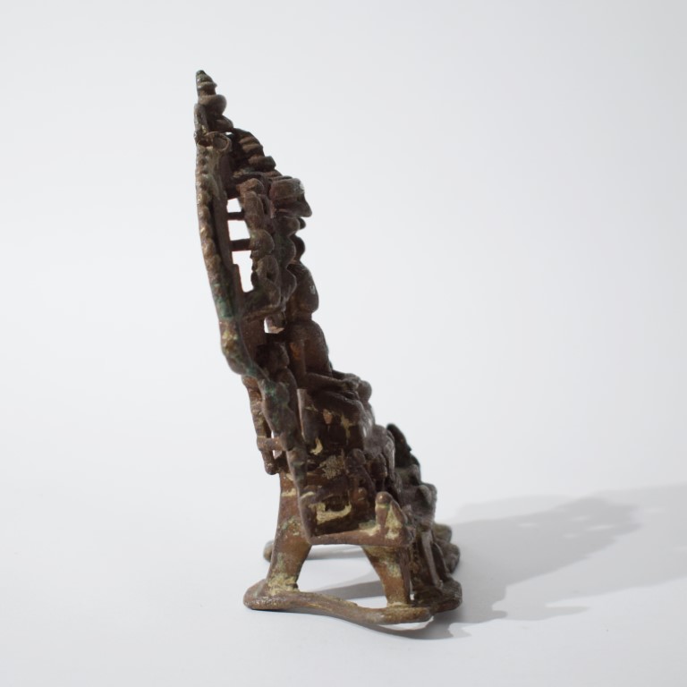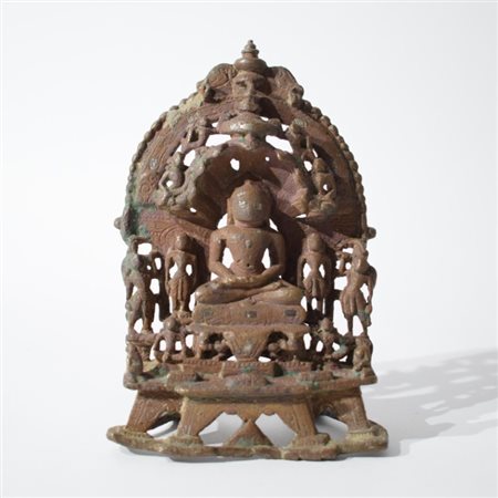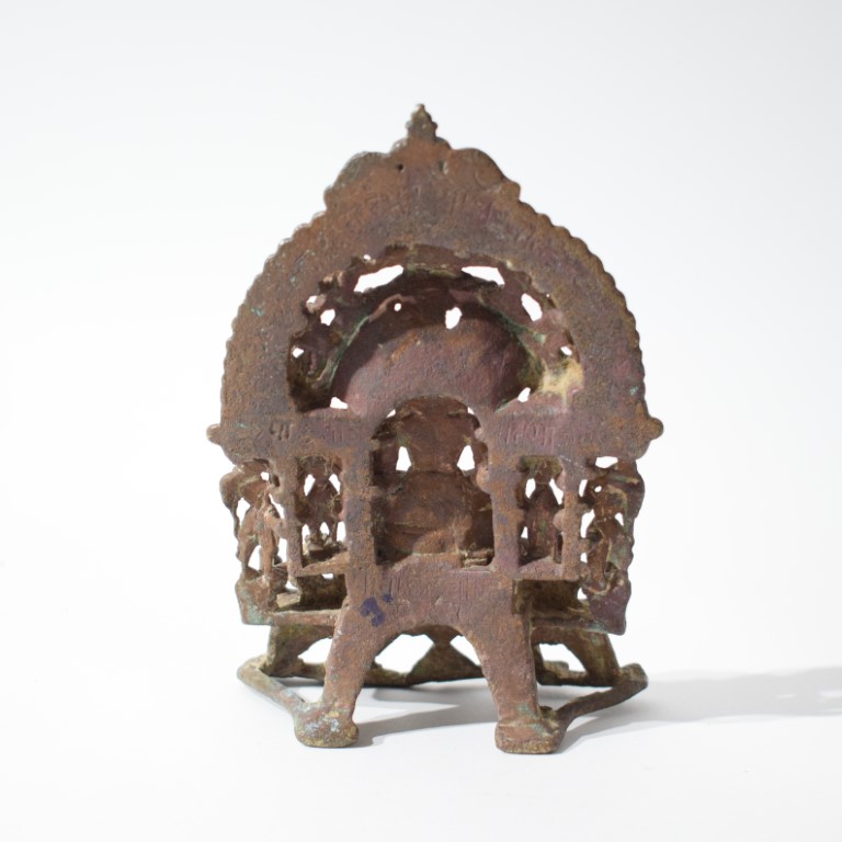 La figura centrale, nuda secondo la tradizione digambara, è seduta in posizione padmasana su un trono ornato e rialzato; le mani sono raccolte in grembo in dhyanamudra. L’iconografia è sobria e dominata dalla presenza di un naga, il grande serpente a più teste che forma il parasole protettivo sulla testa del Tirthankara e attributo iconografico distintivo di Parshvanatha, il ventitreesimo dei Tirthankara jainisti. La figura è affiancata da due assistenti divini, yaksha e yakshi, figure di accompagnamento comuni nelle raffigurazioni tardo-medievali di ambito jainista. L’intera composizione è incorniciata da una prabhamaṇḍala (aureola architettonica) finemente traforata e decorata con una schiera di figure celesti in volo rendono omaggio a Parshvanatha. Il basamento presenta un elegante zoccolo profilato. L’opera è realizzata con la tecnica della fusione a cera persa ed è arricchita da intarsi in rame e argento in ossequio alla tradizione bronzistica dell’India occidentale in epoca medievale. Sul retro dell’altare si trova un’iscrizione in scrittura devanagari medievale parzialmente consunta. La fascia superiore e laterale reca la formula devozionale: