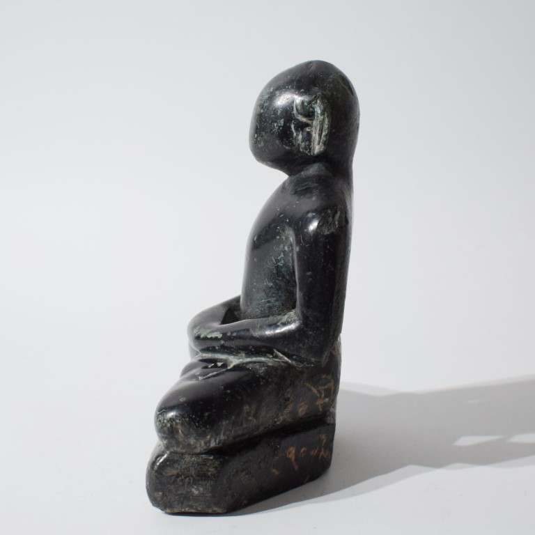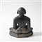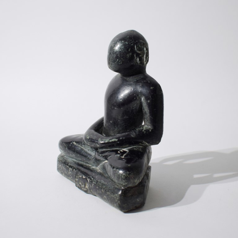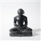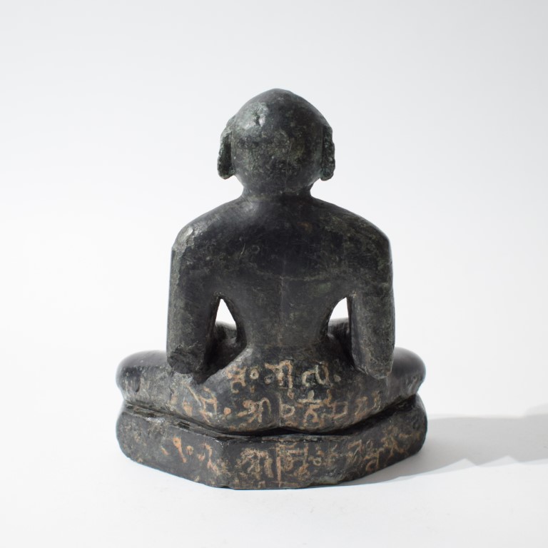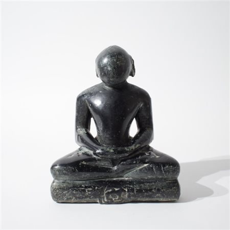 Scultura raffigurante Shri Vardhamana Mahavira (lett. il venerabile, prosperante Grande Eroe), ventiquattresimo e ultimo Tirthankara del jainismo, qui rappresentato in posizione meditativa seduto nella posizione del loto (padmasana) con le mani raccolte in dhyanamudra. La figura dai tratti essenziali è priva di ornamenti in linea con l’iconografia della corrente digambara che esalta il distacco radicale del Tirthankara dal mondo materiale.