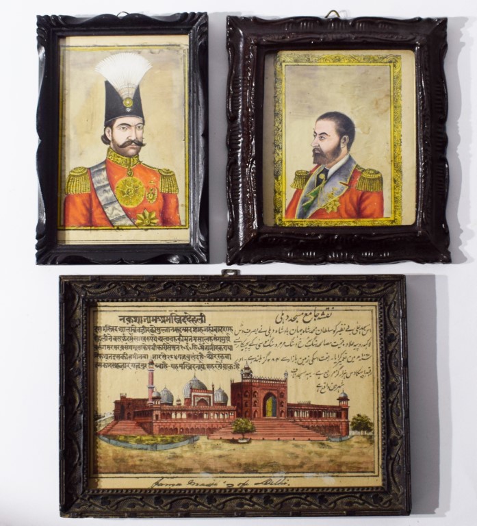 Gruppo di stampe litografiche dipinte a mano tratte da un testo storico oggi non identificato, raffigurano due personaggi e una veduta architettonica: da un lato l'Imperatore persiano Naser al-Din Shah Qajar riconoscibile per l'elaborato copricapo piumato e l'uniforme cerimoniale e dall'altro il Principe del Galles, futuro Edoardo VII, in uniforme rossa ornata di decorazioni onorifiche. L'ultima stampa mostra una veduta accurata e colorata del Forte Rosso di Delhi accompagnata da testi descrittivi in urdu e devanagari che riportano la denominazione storica del monumento, Lal Qila. Le litografie colorate a mano con pigmenti vivaci sono una prassi tipica delle edizioni di lusso prodotte nell'India britannica e nelle corti regionali dell'epoca. Cornici non coeve. Provenienza: Collezione Italia Centrale.