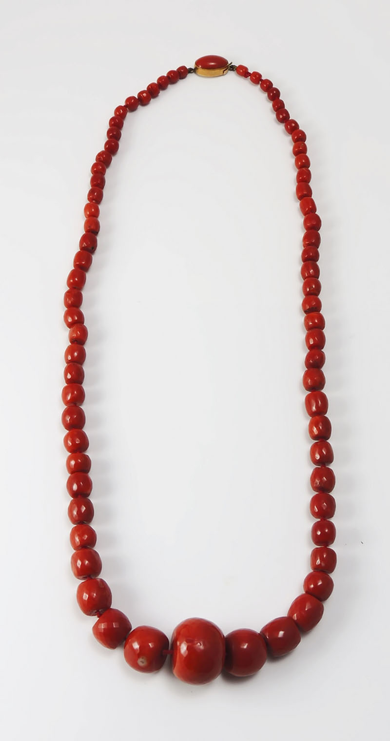COLLANA IN CORALLO ROSSO GIAPPONESE formata da barilotti sfaccettati scalari, chiusura in oro giallo con corallo cabochon ovale diam mm 5,5/24, gr 115 RED JAPANESE CORAL NECKLACE