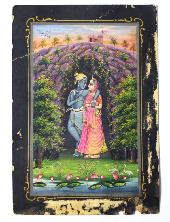 Raffigurante l'incontro tra Krishna e Radha all'interno di una grotta situata nel monte sacro di Govardhan nei pressi di Mathura (Uttar Pradesh). La composizione fonde elementi tardo-moghul con influenze europee ravvisabili nella resa atmosferica e paesaggistica. Il paesaggio collinare che avvolge la coppia è dipinto con una prospettiva dolcemente ascensionale animato da vegetazione lussureggiante, fiori di loto in primo piano e uccelli in volo, fino ad aprirsi a una visione profonda di un tempio sullo sfondo.