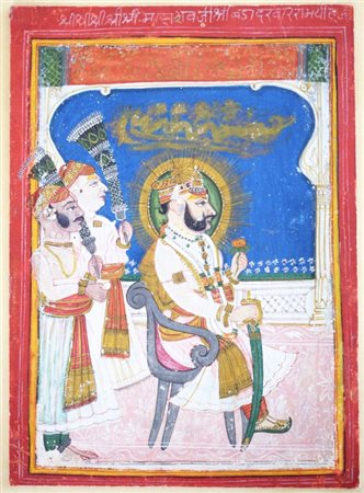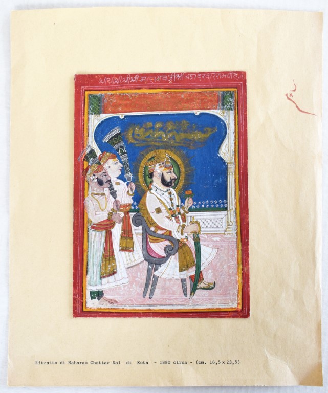 Gouache e oro su carta, raffigurante Ram Singh, Maharao di Kotah dal 1828 al 1866. Il sovrano è ritratto di profilo, seduto su una sedia di foggia europea, abbigliato con sontuosi vestiti e vistosi gioielli, compresa la spada cerimoniale. Dietro di lui due attendenti con lo scacciamosche. Il ritratto celebrativo è contenuto entro quinta architettonica con drappo sollevato e l'identità del soggetto è confermata nell'iscrizione in caratteri devanagari vergata con inchiostro bianco nella cornice superiore del dipinto.